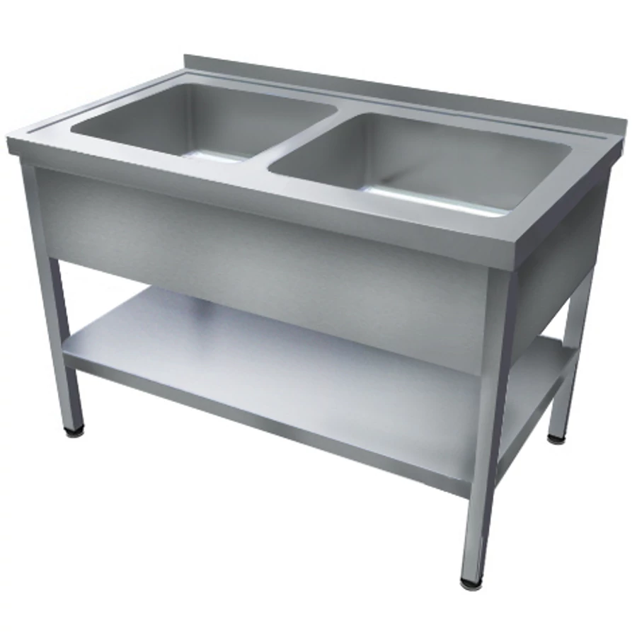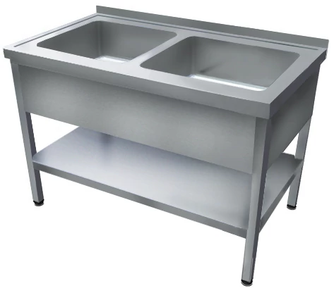 1200mm 2 medencés nagykonyhai mosogató 500x600x300mm medencékkel, lábra állítva, polccal, r.m. acél