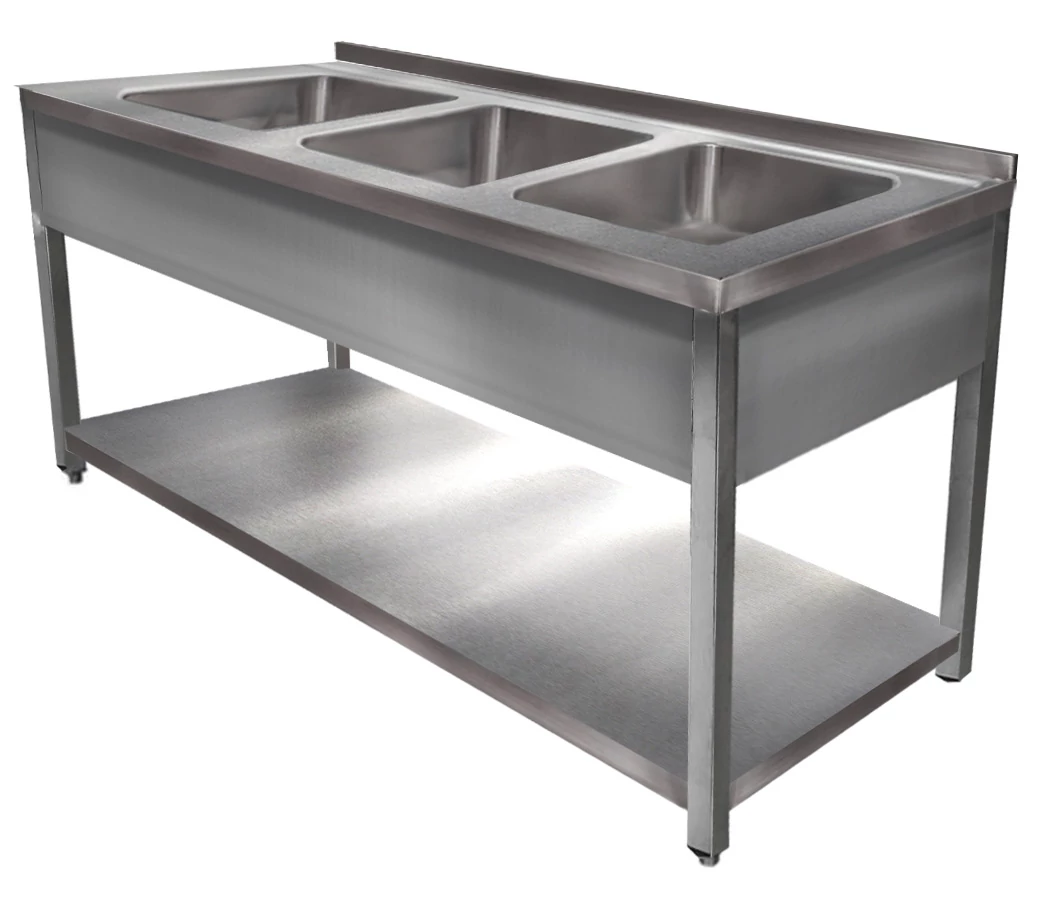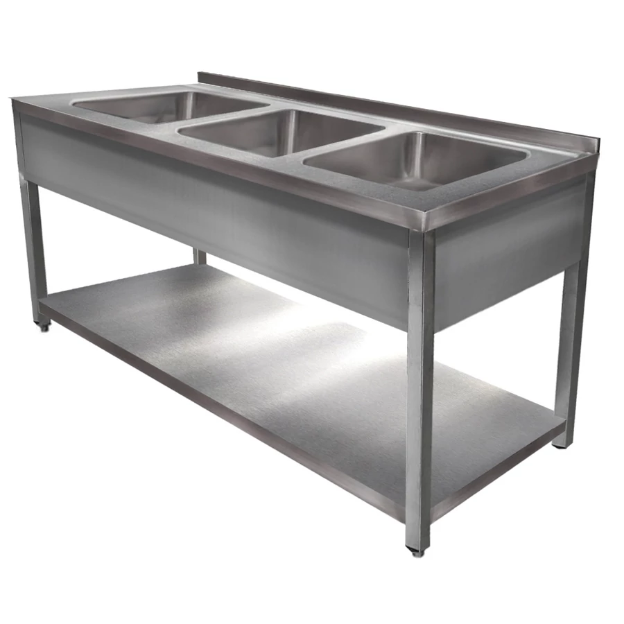 1800mm 3 medencés nagykonyhai mosogató 500x500x300mm medencékkel, lábra állítva, r.m. acél