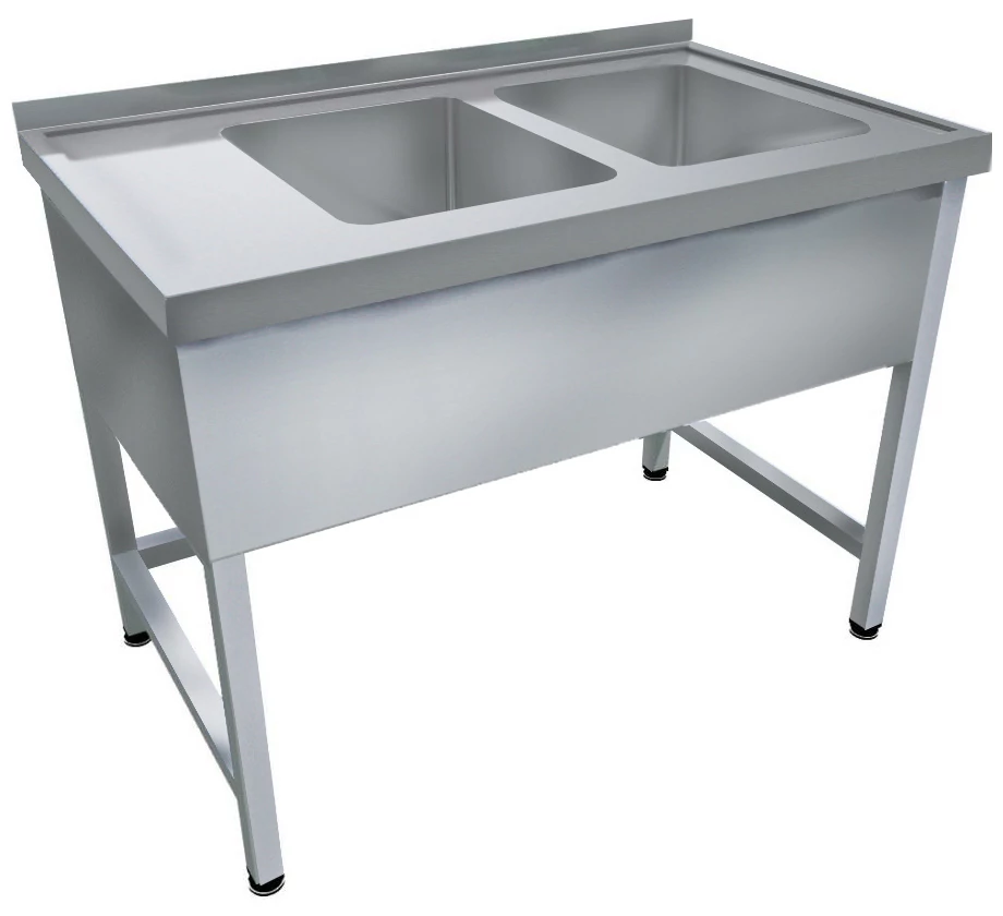 1200mm 2 medencés nagykonyhai mosogató 500x600x300mm medencékkel, lábra állítva, takaróköpennyel, polccal, r.m. acél