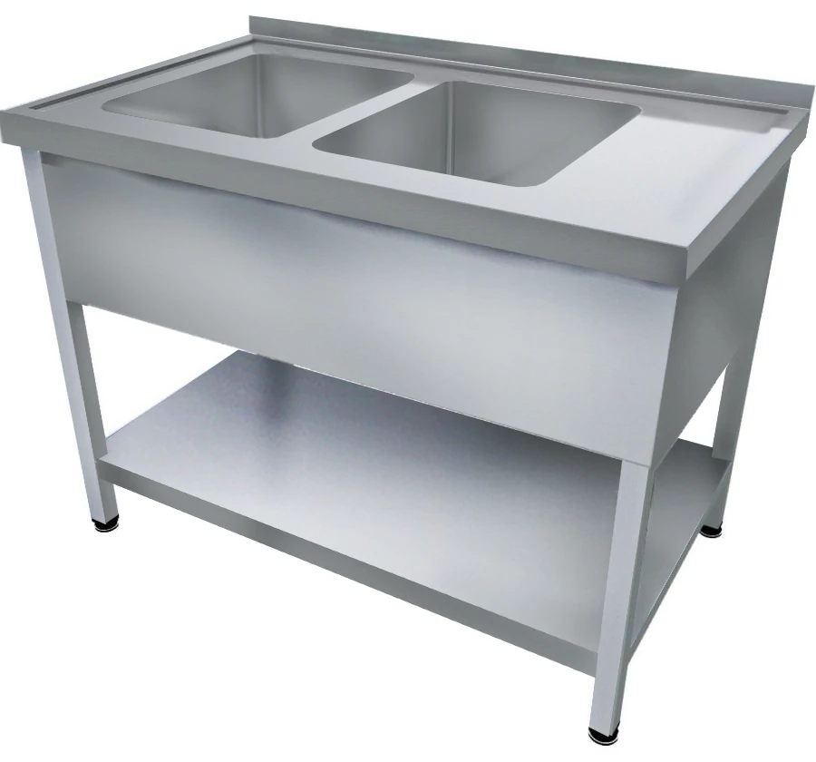 1200mm 2 medencés nagykonyhai mosogató 500x600x300mm medencékkel, lábra állítva, takaróköpennyel, polccal, r.m. acél