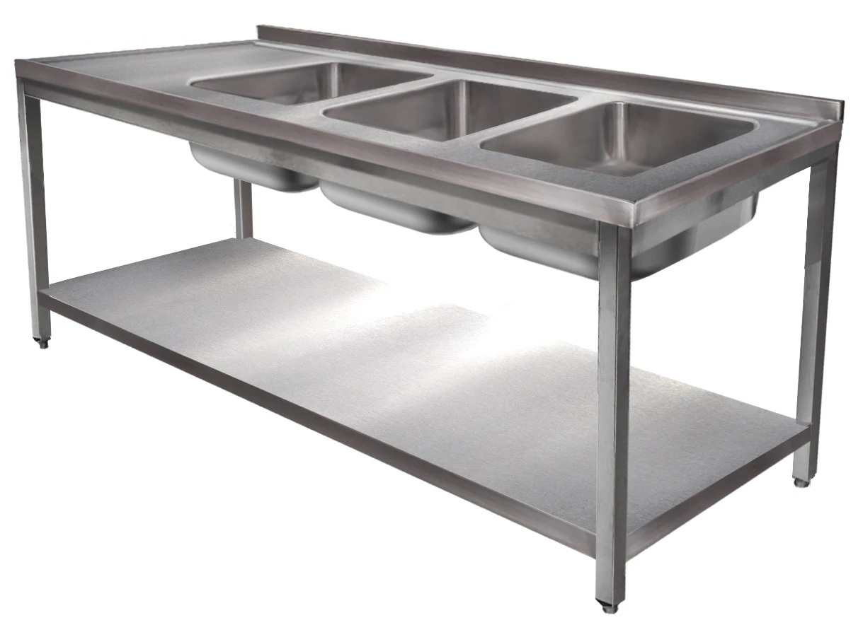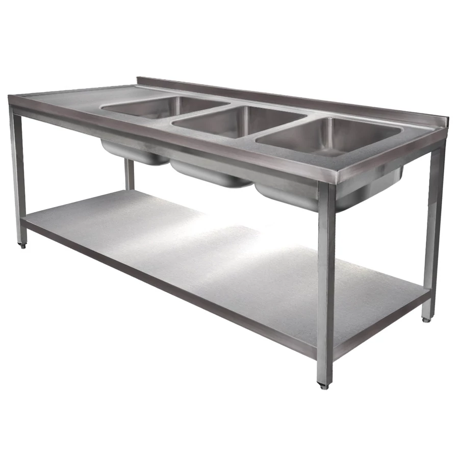 1800mm 3 medencés nagykonyhai mosogató 500x600x300mm medencékkel, lábra állítva, r.m. acél
