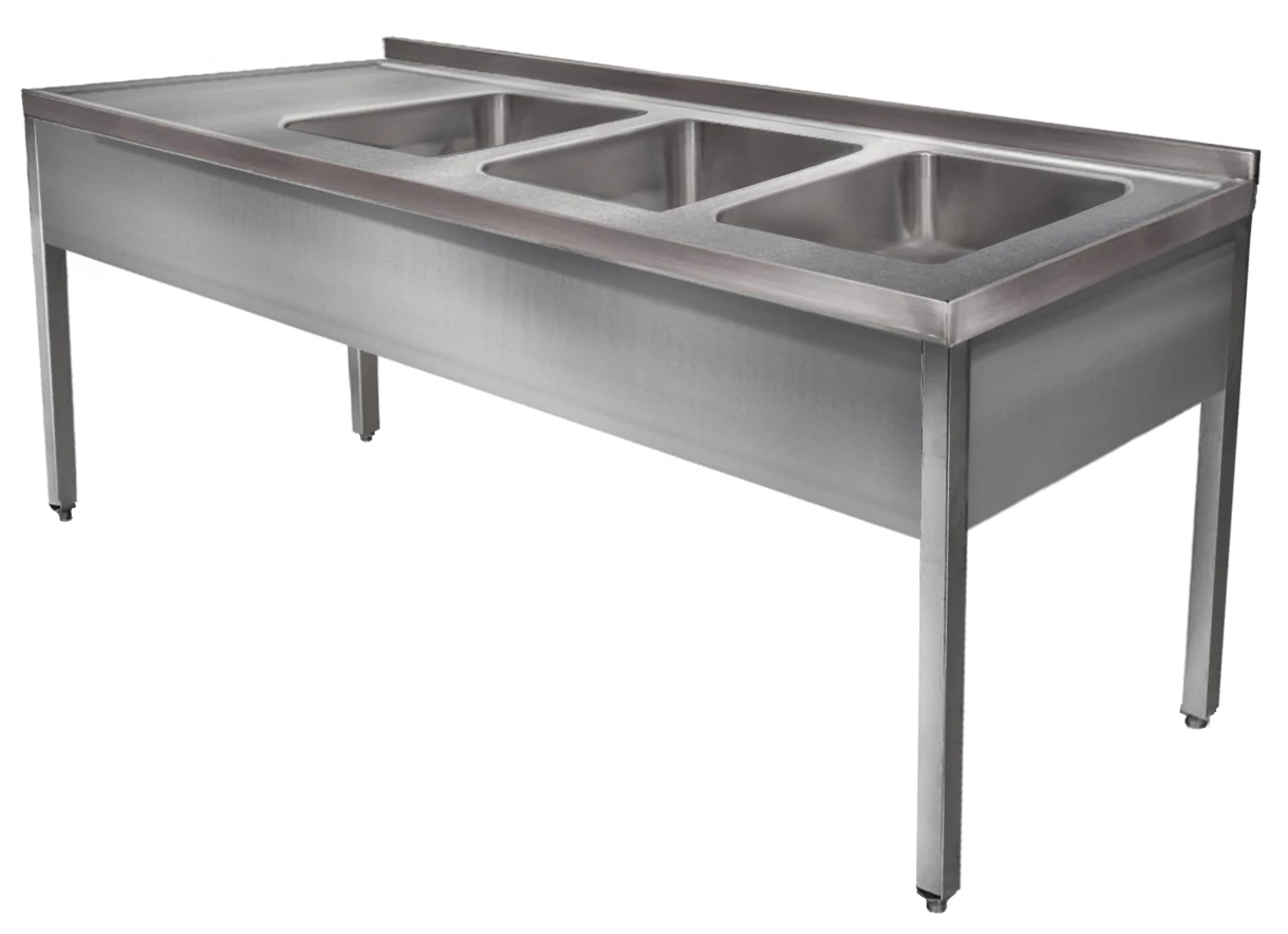 1800mm 3 medencés nagykonyhai mosogató 500x500x300mm medencékkel, lábra állítva, takaróköpennyel, r.m. acél