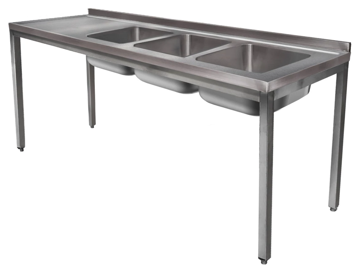 1800mm 3 medencés nagykonyhai mosogató 500x600x300mm medencékkel, lábra állítva, takaróköpennyel, polccal, r.m. acél