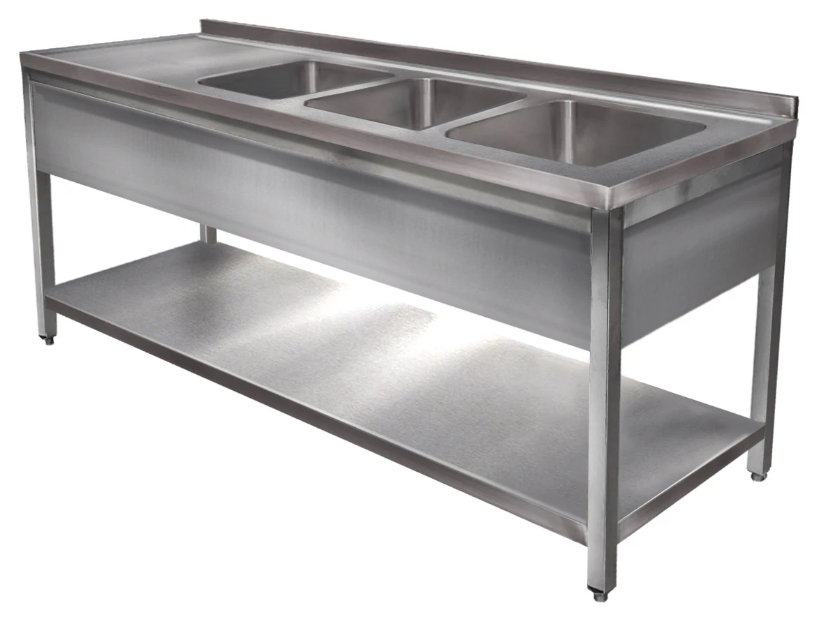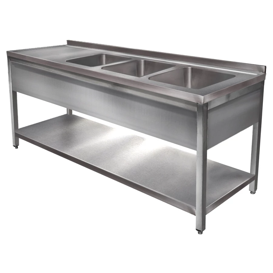2400mm 3 medencés nagykonyhai mosogató bal oldali csepegtetővel, 500x500x300mm medencékkel, lábra állítva, polccal, r.m. acél