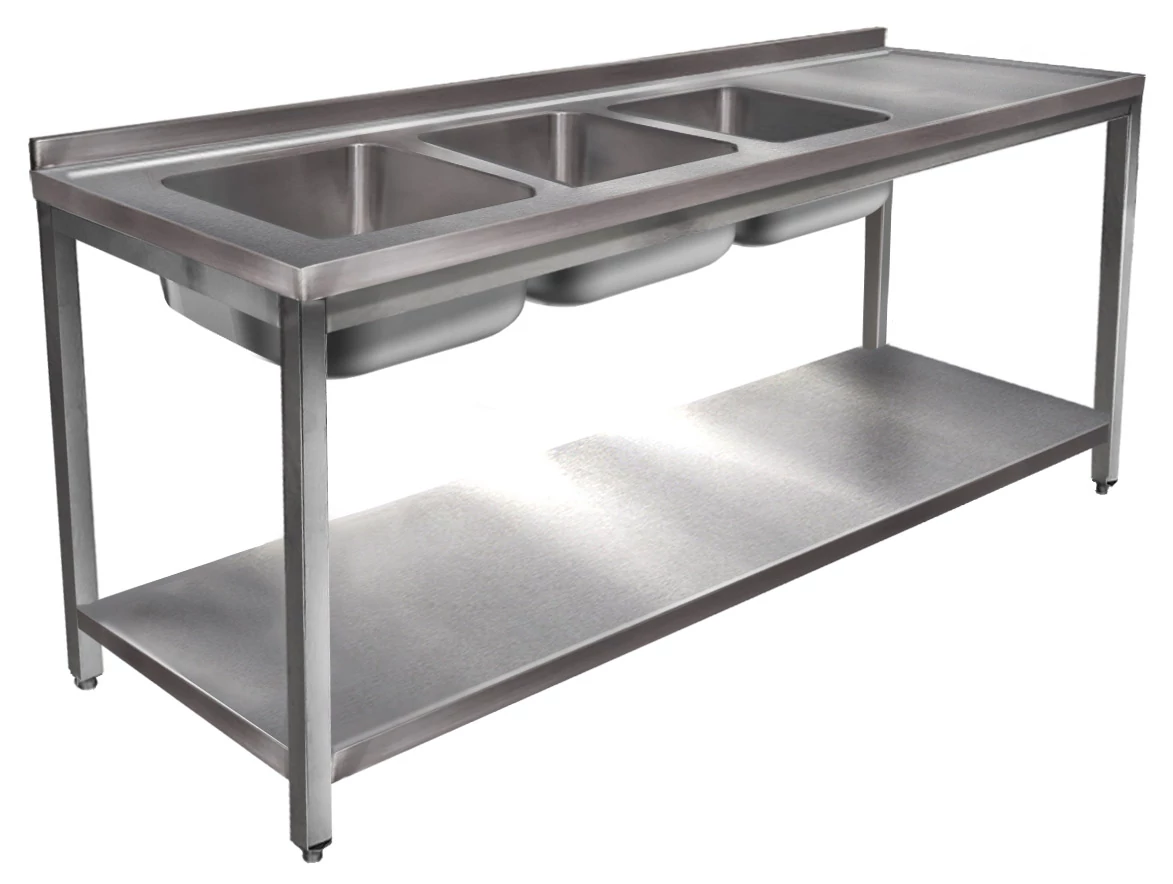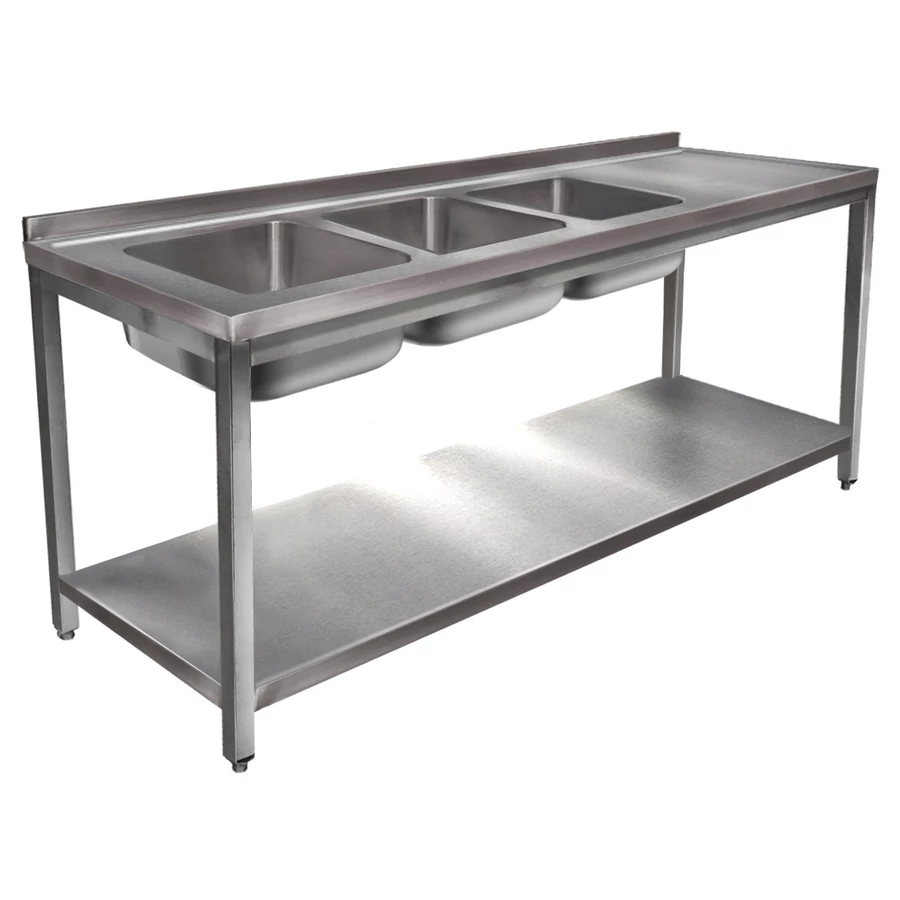 2400mm 3 medencés nagykonyhai mosogató bal oldali csepegtetővel, 500x500x300mm medencékkel, lábra állítva, polccal, r.m. acél