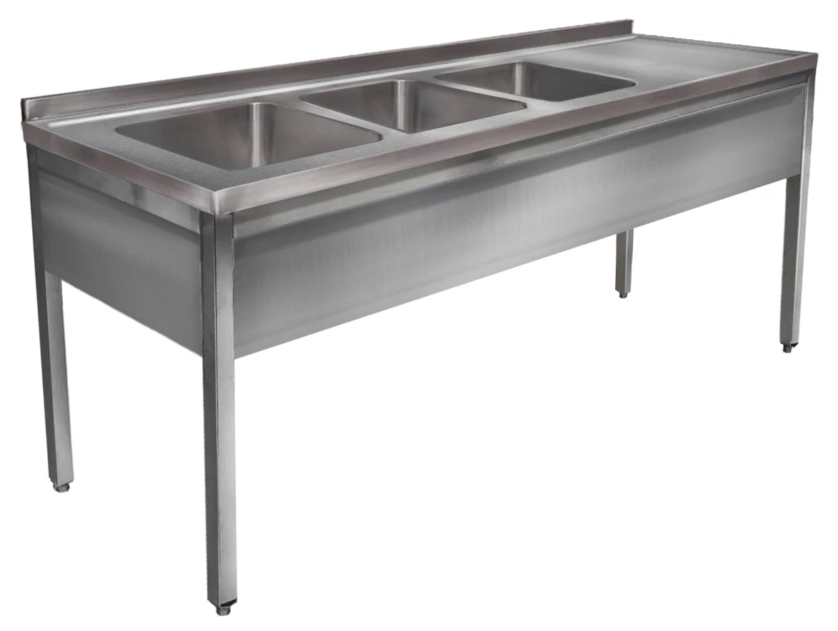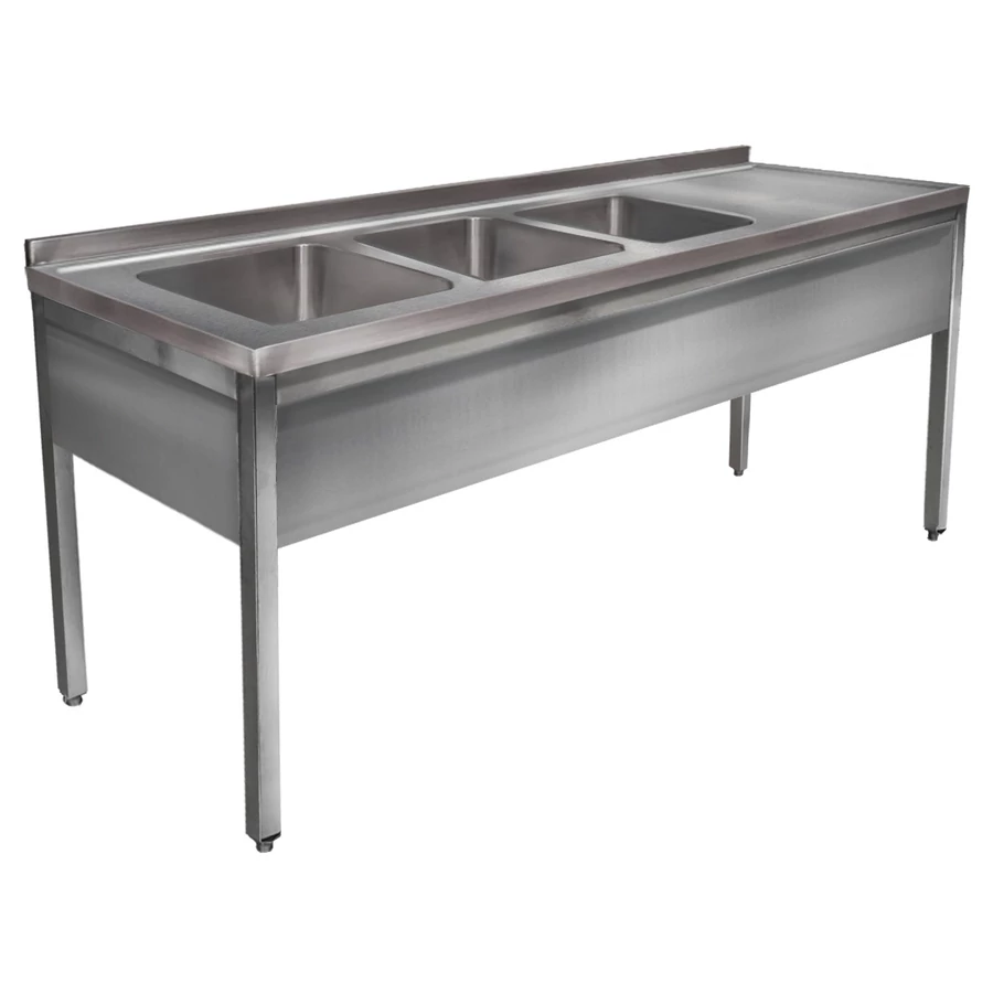 2400mm 3 medencés nagykonyhai mosogató jobb oldali csepegtetővel, 500x500x300mm medencékkel, lábra állítva, r.m. acél