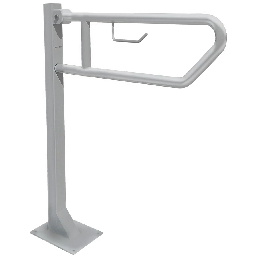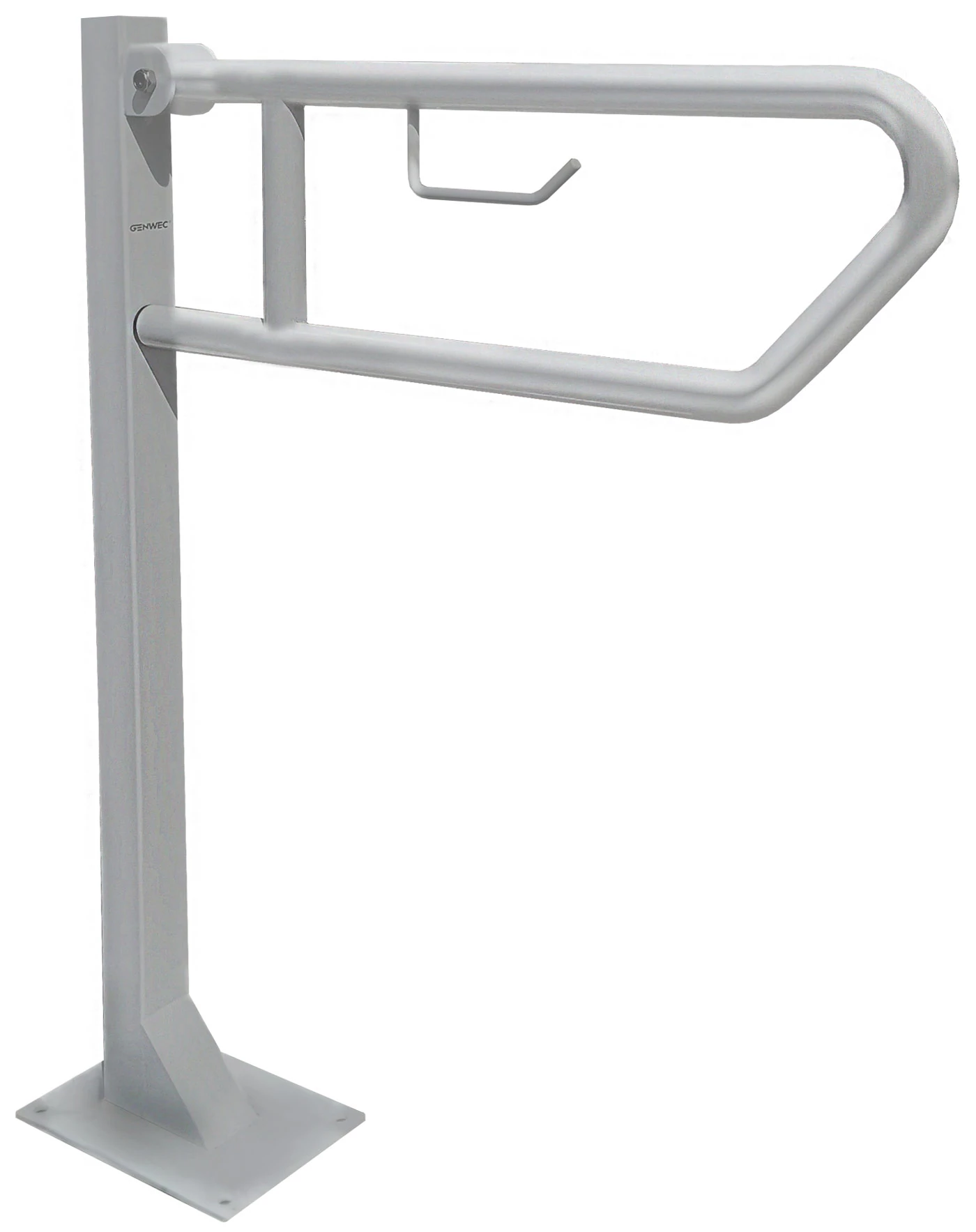 A függőlegesen felhajtható rozsdamentes acél kapaszkodó a közösségi mellékhelyiségek padlójára rögzíthető. A padlóra rögzítés akkor ajánlott, hogyha a fal könnyűszerkezetű elemből készült. A selyem matt borítás elegáns megjelenést kölcsönöz a mellékhelyiségeknek.