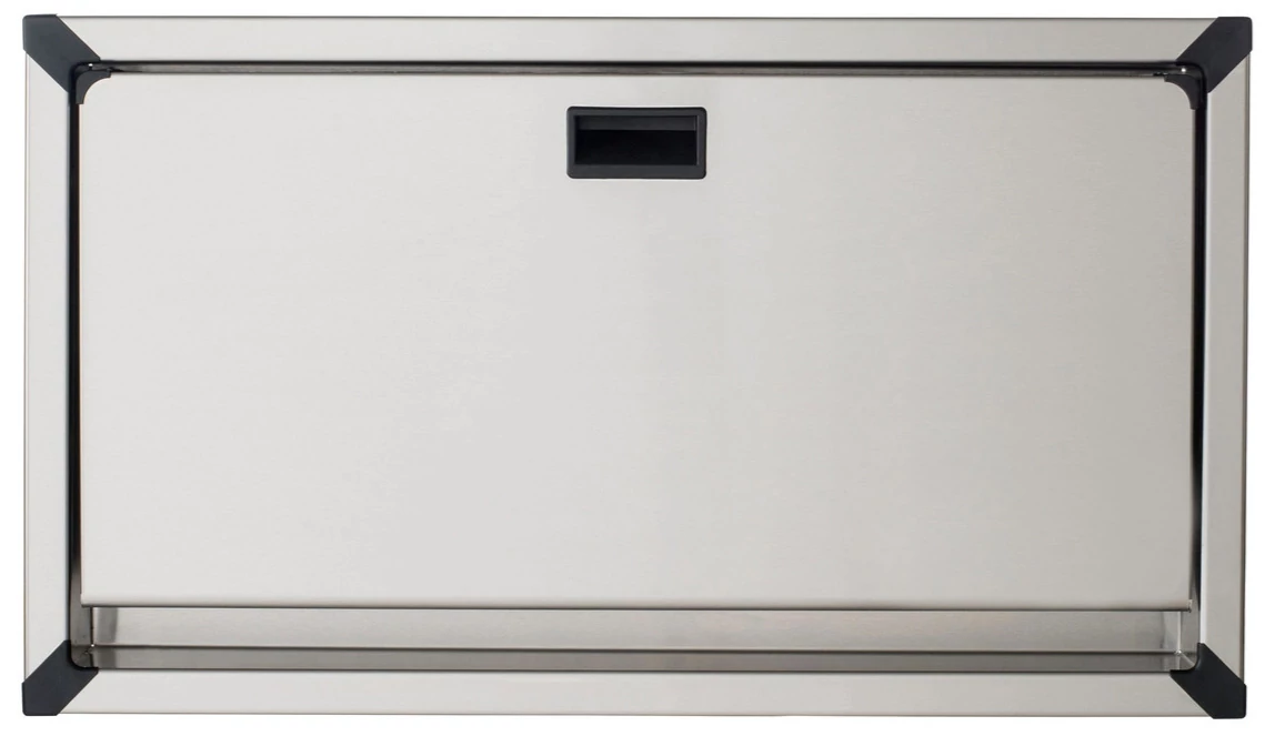 Vandálbiztos beépített lehajtható pelenkázó rozsdamentes acél testtel, ABS belsővel, vízszintes, selyem