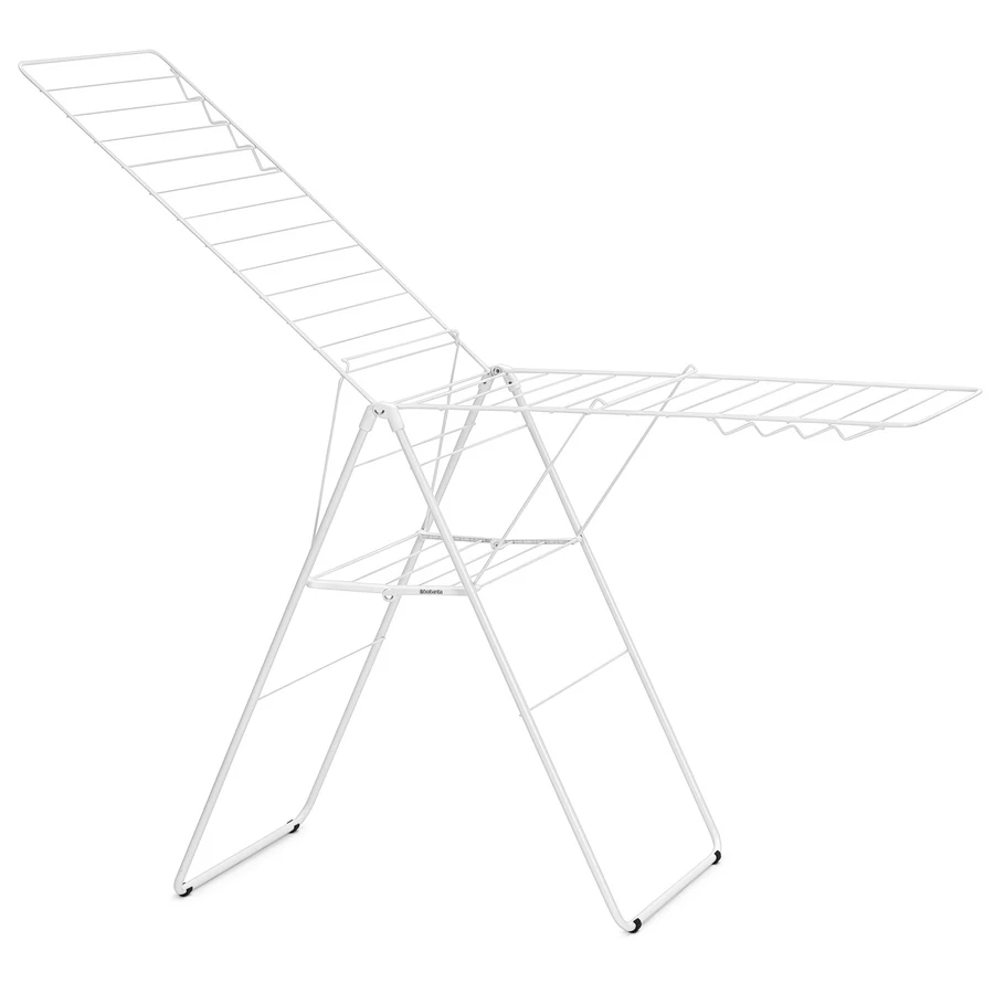 A Brabantia HangOn ruhaszárító állvány 25 méteres szárítófelülettel és 8 ruhaakasztó kampóval ideális választás a nagyobb háztartások számára. Fehér színű, stabil acélszerkezetével akár 12 kg ruhát is elbír, miközben összecsukható kialakítása helytakarékos tárolást biztosít a mindennapokban.