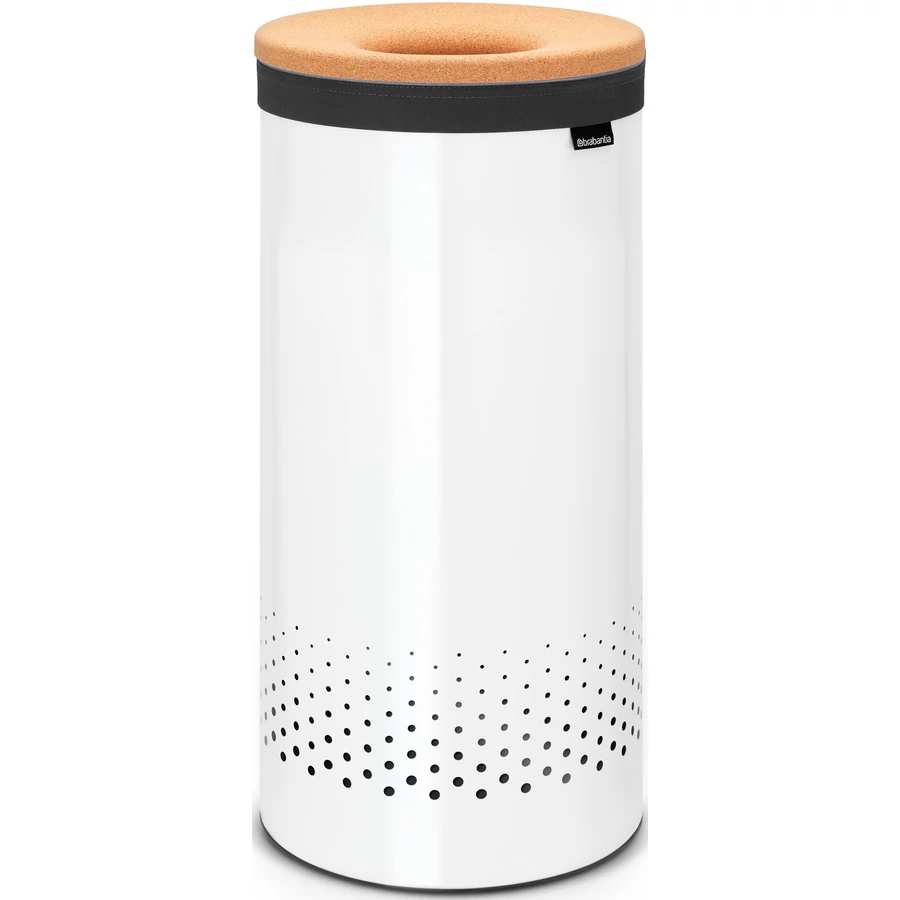 Brabantia Laundry Bin szennyestartó szellőző nyílásokkal, tépőzáras, mosható szennyesgyűjtő zsák, henger forma, közepes méret 35L, parafa fedő, acél, fehér - 104367