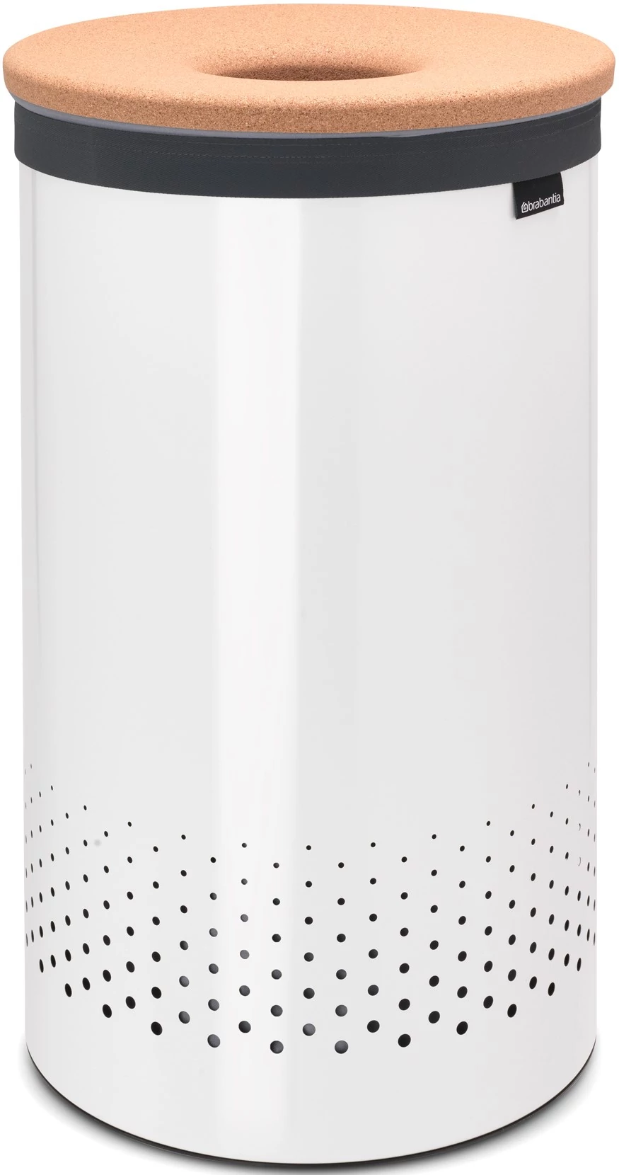 Brabantia Laundry Bin szennyestartó szellőző nyílásokkal, tépőzáras, mosható szennyesgyűjtő zsák, henger forma, nagy méret 60L, parafa fedő, acél, fehér - 104404
