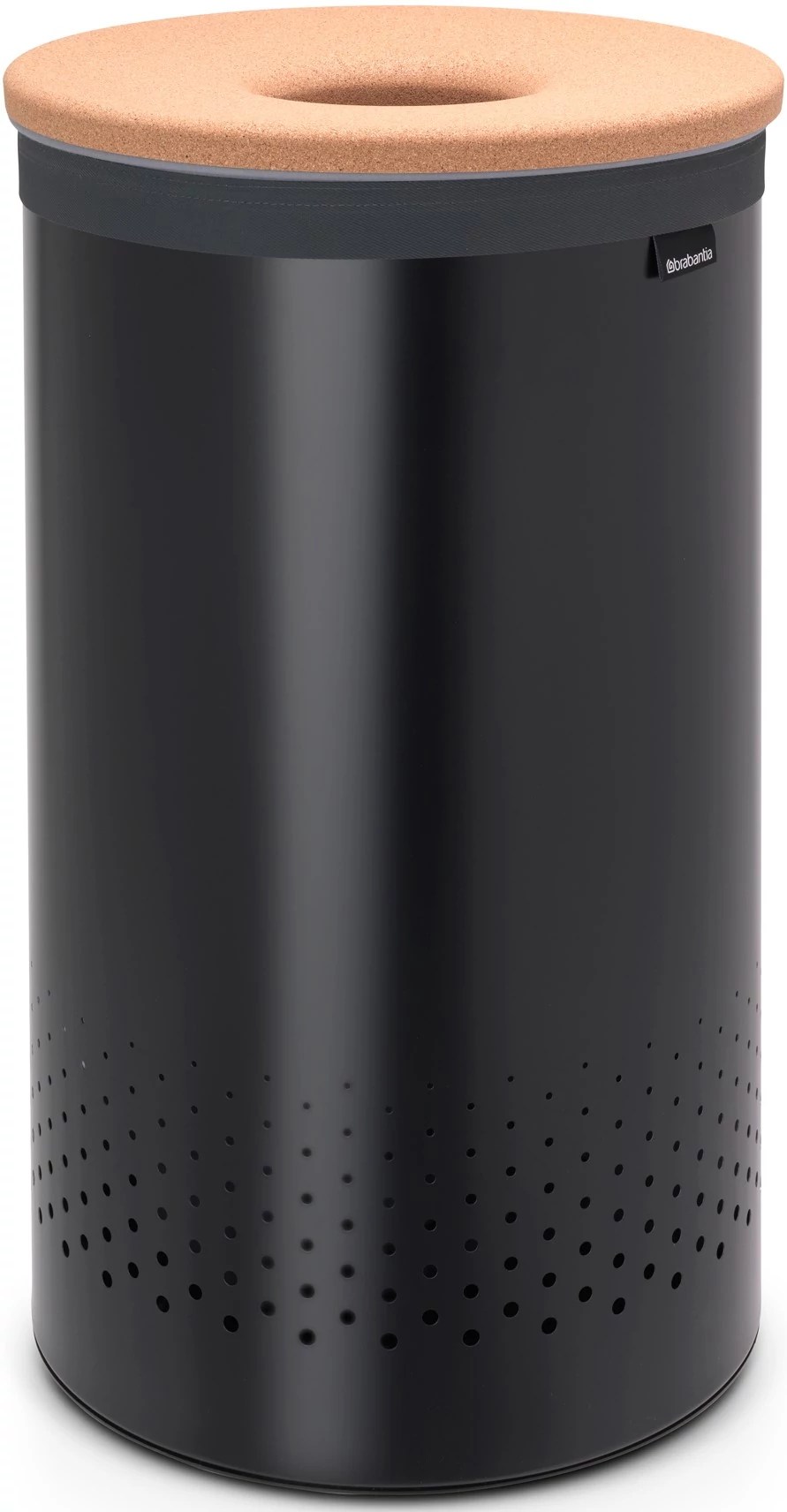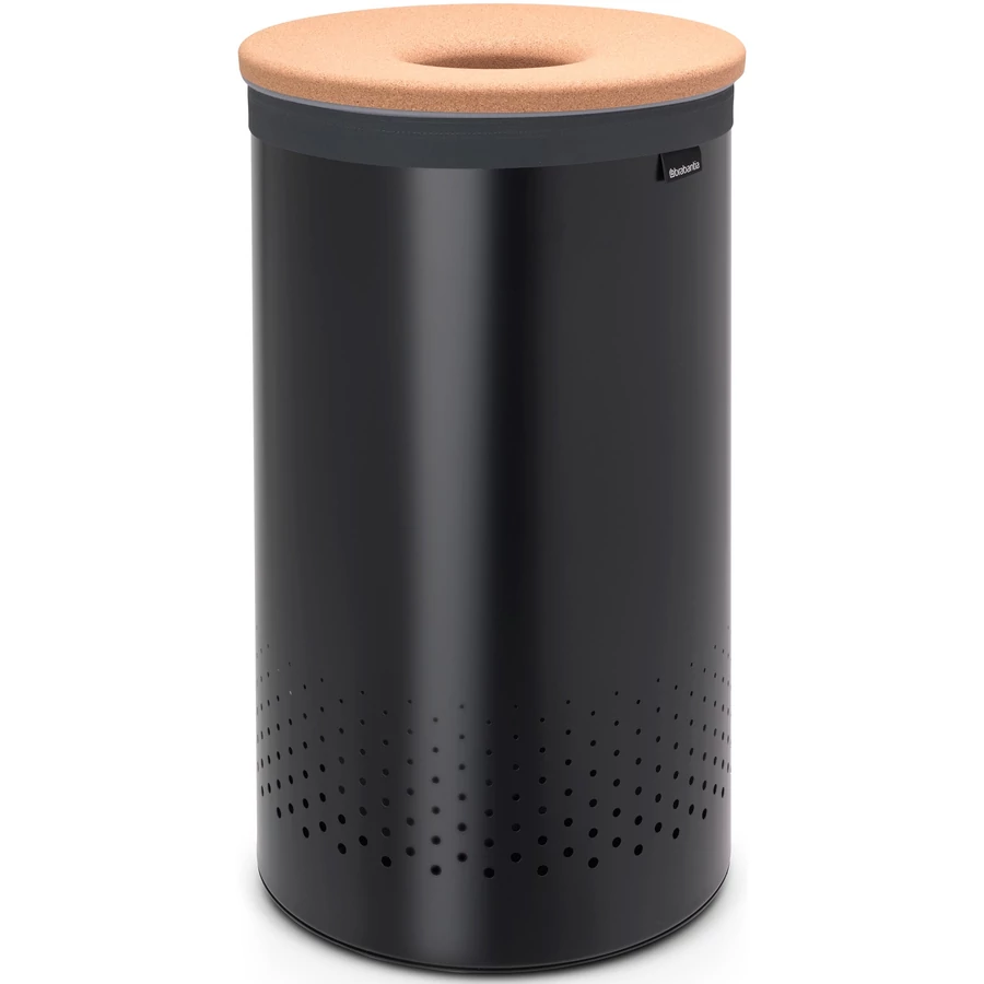 Brabantia Laundry Bin szennyestartó szellőző nyílásokkal, tépőzáras, mosható szennyesgyűjtő zsák, henger forma, nagy méret 60L, parafa fedő, acél, matt fekete - 120022