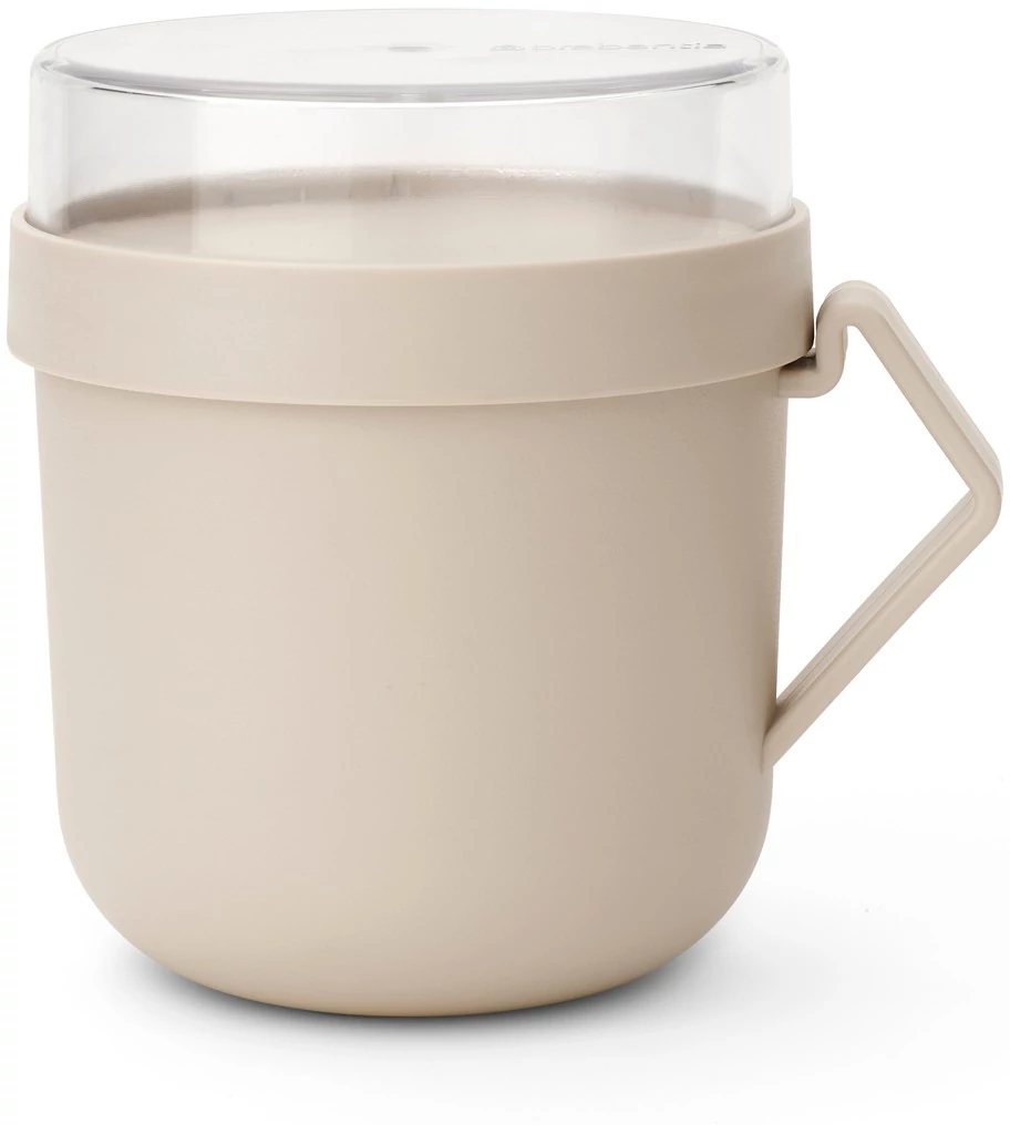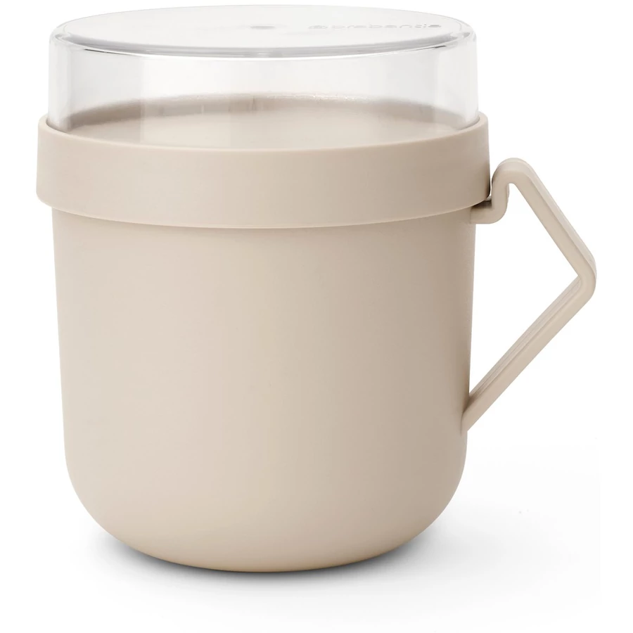 Brabantia Make & Take Soup Mug leveses bögre, 600 ml, hőálló fogantyú, beépített gőzkieresztő szelep, felső tárolórekesz, szivárgás- és légmentes záródás, BPA mentes műanyag, világos bézs