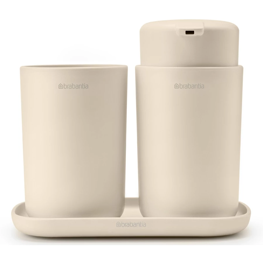 Brabantia ReNew 3db-os fürdőszobai pipere csomag - pumpás folyékonyszappan adagoló, fogkefetartó, pipere tálca, műanyag, világos bézs - 223402