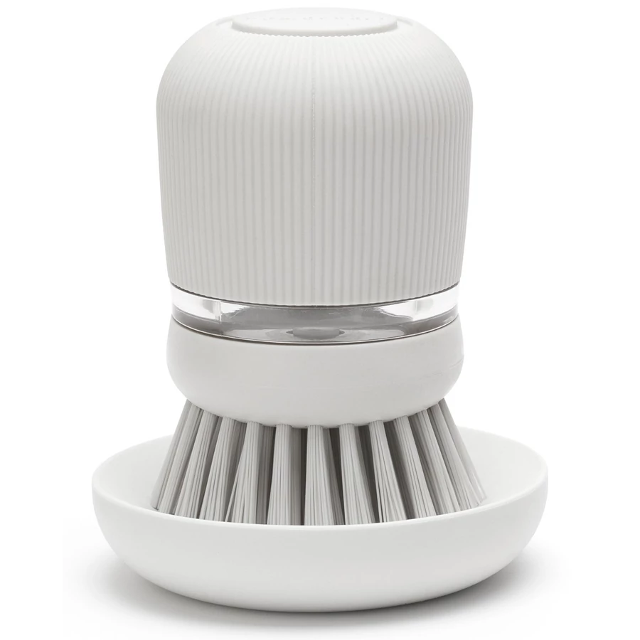 A Brabantia mosogatókefe beépített mosogatószer adagolóval egy praktikus konyhai eszköz, amely megkönnyíti a kézi mosogatást. A lekerekített fejben található 100 ml-es tartály könnyen utántölthető folyékony mosogatószerrel. A tetején lévő gomb megnyomásával adagolhatja a mosogatószert az edényekre. A műanyag sörték hatékonyak a súrolásban, de nem karcolják meg az edényeket. A kefe higiénikus tárolását egy kis tálca biztosítja. A világos szürke szín jól illik a sötét konyhákhoz.