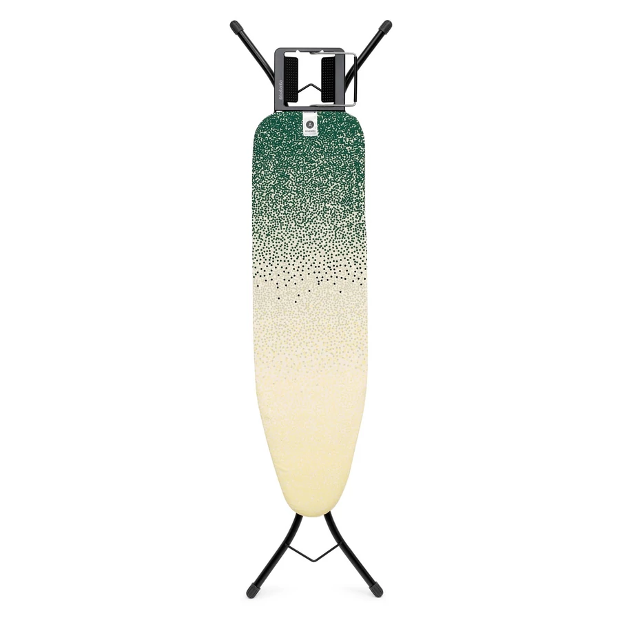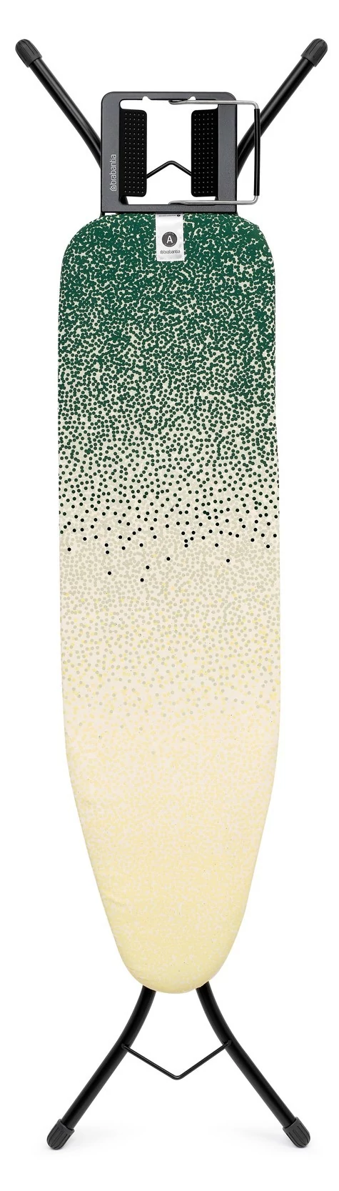Innovatív, A-méretű Brabantia vasalódeszka újhajnal színű, Fairtrade minősítésű pamuthuzattal. A 1100x300 mm-es vasalófelület és az állítható magasság (690-960 mm) tökéletes vasalási élményt biztosít. A stabil váz és a praktikus vasalótartó minden igényt kielégít.