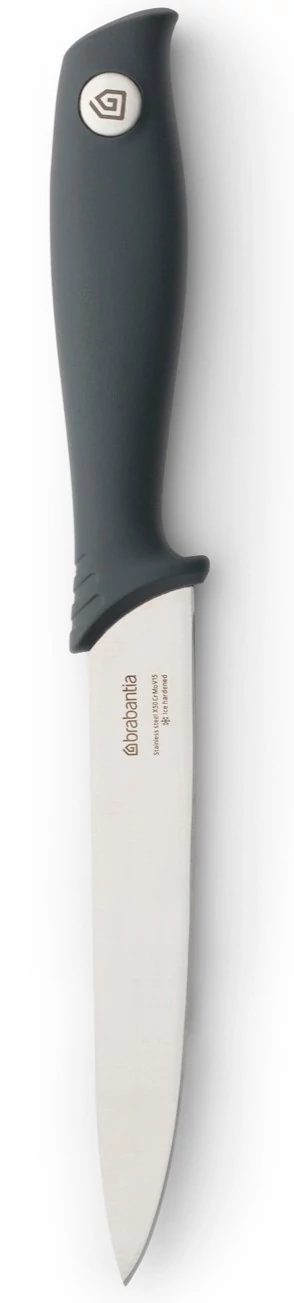 A Brabantia Tasty+ univerzális kés kiváló eszköz a mindennapi konyhai előkészítéshez. Jégkeményedett, magas széntartalmú rozsdamentes acél pengéje tartós élességet biztosít, míg az ergonomikus markolat és beépített ujjvédő maximális biztonságot nyújt használat közben.
