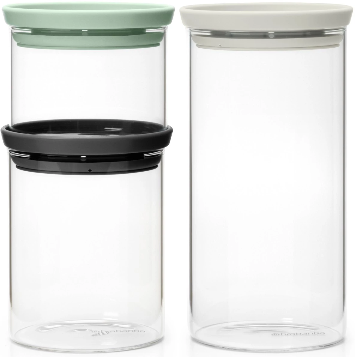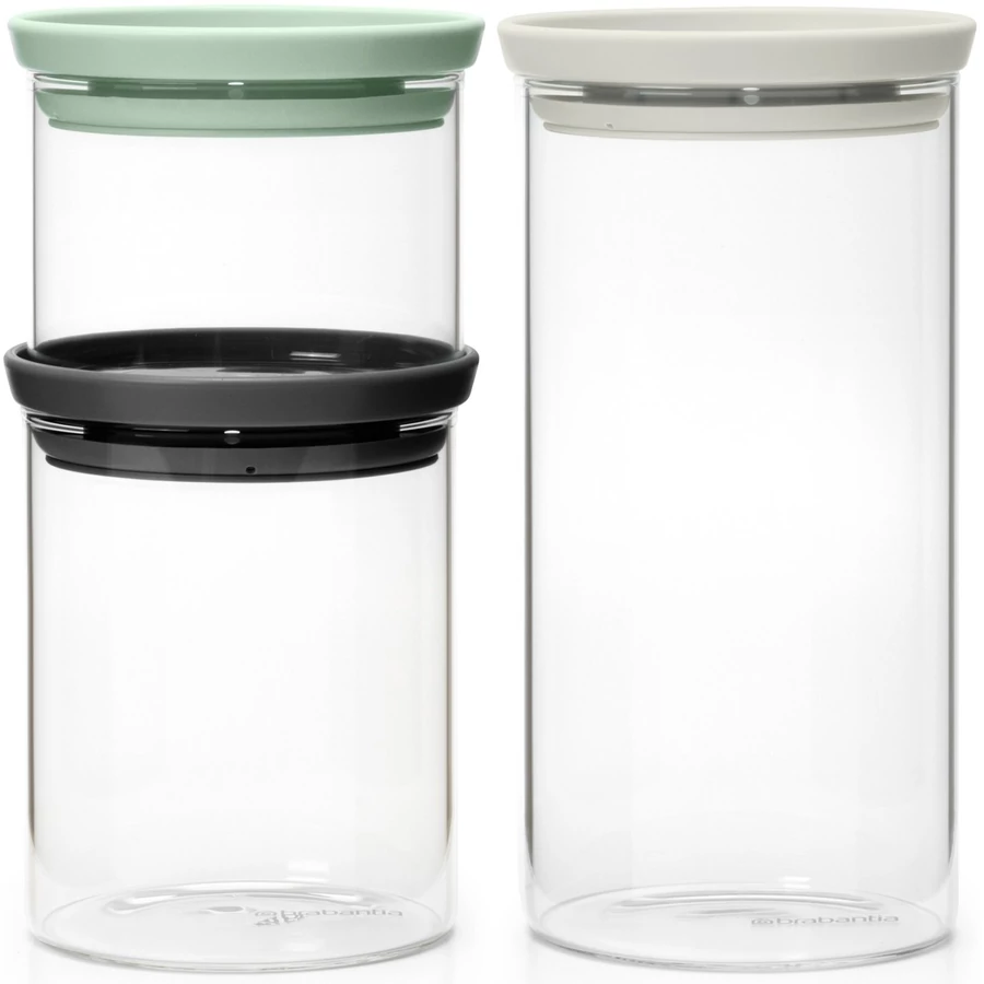Brabantia üvegedény készlet, 3db-os, 0,3L/0,6L/1,1L, egymásra rakható, légmentes záródás, kerek, világosszürke, sötétszürke, jáde zöld fedők, átlátszó üveg tartály - 100550