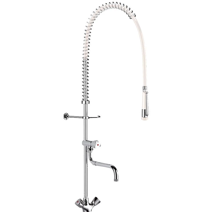 DELABIE fali nagykonyhai mosogató csaptelep szett lengő kifolyóval, rugó megerősítésű antitorziós elő-öblítő zuhannyal, hideg-meleg vízre