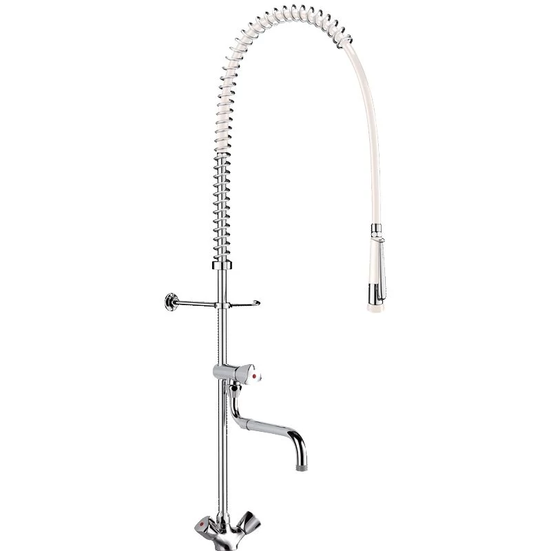 DELABIE fali nagykonyhai mosogató csap lengő kifolyóval, r.m. acél rugóval megerősített antitorziós, fehér PVC tömlős elő-öblítő zuhannyal