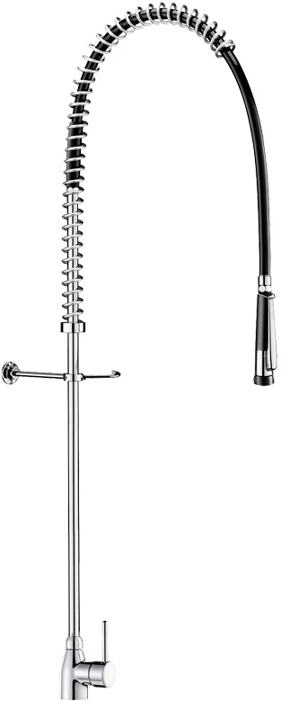 DELABIE álló nagykonyhai mosogató csap lengő kifolyóval, r.m. acél rugóval megerősített antitorziós, fehér PVC tömlős elő-öblítő zuhannyal