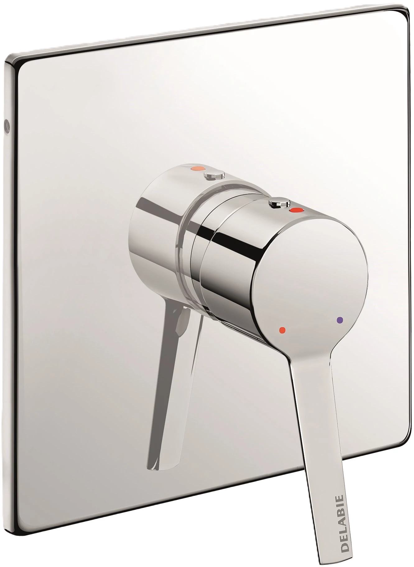 DELABIE beépített zuhanycsaptelep előlap teli keverőkarral, falon kívüli könyök vízkivezetéssel, hőmérséklet-határolóval, 160x160mm, r.m. acél, fényes, 9L/p, kit 2/2