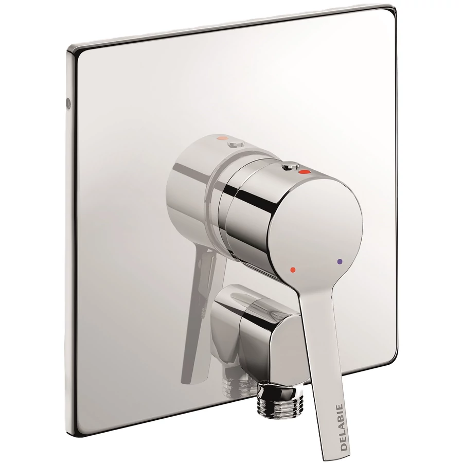 DELABIE beépített zuhanycsaptelep előlap EP forrázásgátlós, teli karos keverővel, falon belüli vízkivezetéssel, hőmérséklet-határolóval, 160x160mm, r.m. acél, fényes, 9L/p, kit 2/2