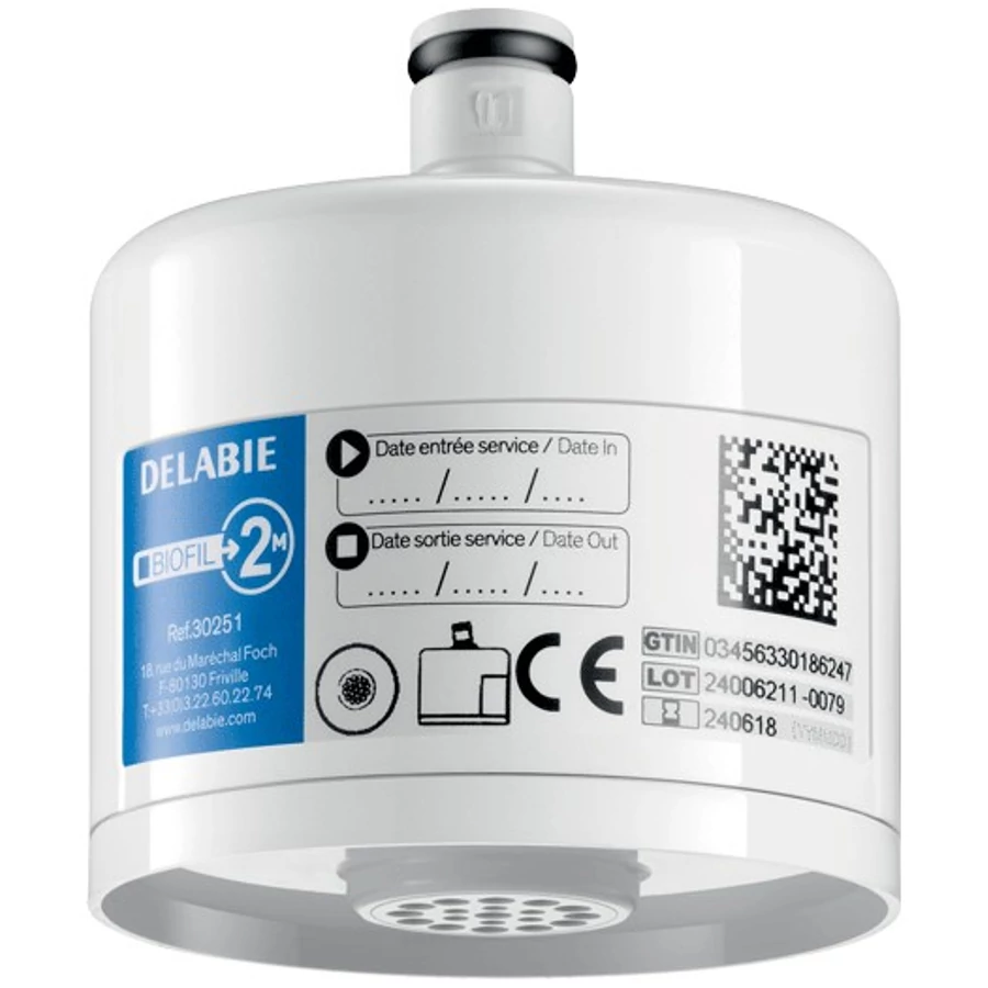 DELABIE BIOFIL nem-steril végponti szűrő mosdócsapra esőztető kifolyóval, PE szűrőrostok, 0.1μm névleges, 0.2μm abszolút szűrés, 6000L, vagy max. 2 hónap szűrőkapacitás