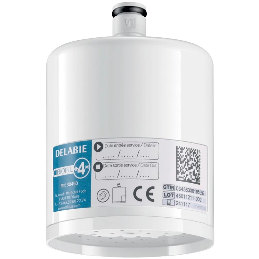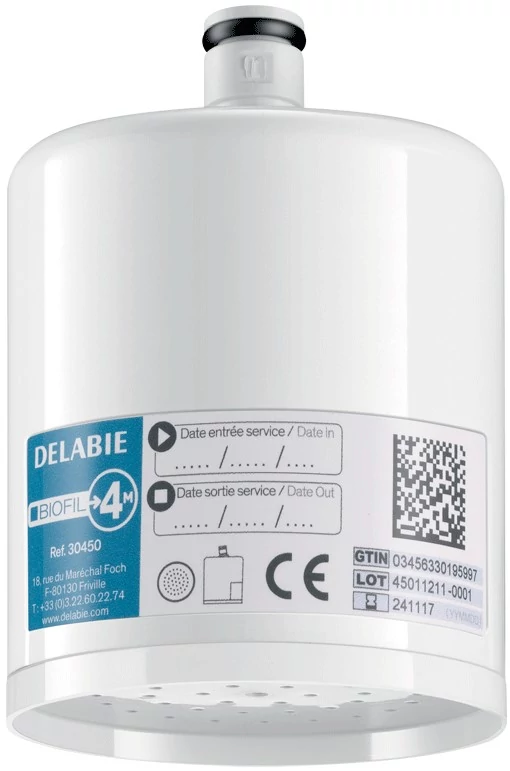 DELABIE BIOFIL nem-steril végponti kézizuhany szűrő esőztető kifolyóval, PE szűrőrostok, 0.1μm névleges, 0.2μm abszolút szűrés, 12000L, vagy max. 4 hónap szűrőkapacitás