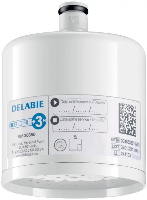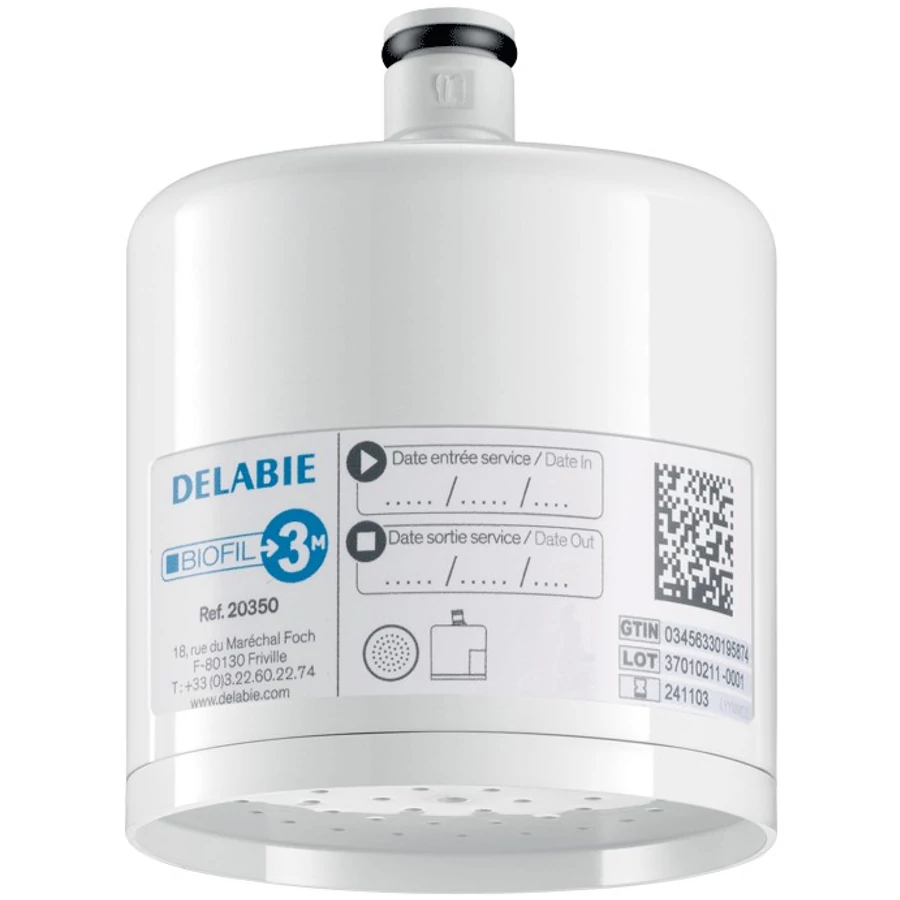 DELABIE BIOFIL nem-steril végponti szűrő mosdócsapra esőztető kifolyóval, PE szűrőrostok, 0.1μm névleges, 0.2μm abszolút szűrés, 9000L, vagy max. 3 hónap szűrőkapacitás
