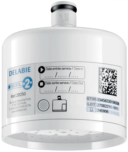 DELABIE BIOFIL nem-steril végponti kézizuhany szűrő esőztető kifolyóval, PE szűrőrostok, 0.1μm névleges, 0.2μm abszolút szűrés, 6000L, vagy max. 2 hónap szűrőkapacitás