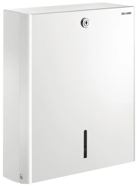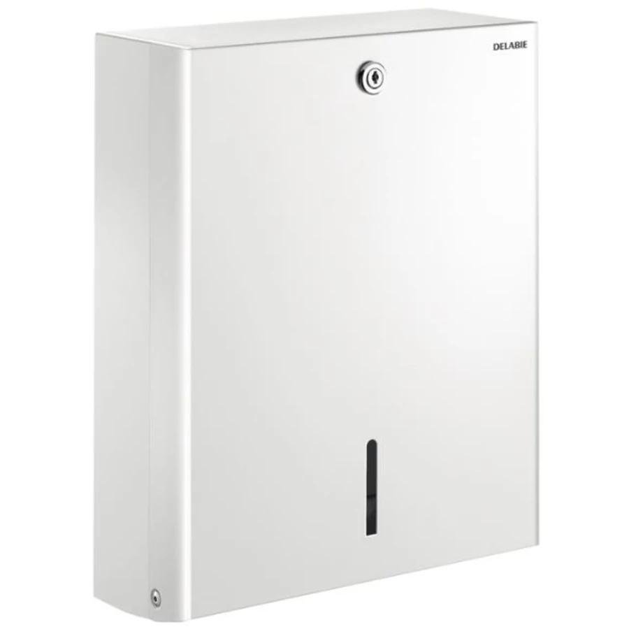 DELABIE vandálbiztos C/Z hajtott kéztörlő adagoló, 1mm vastag, fehér acél ház, zárható, akár 750 lap kapacitás