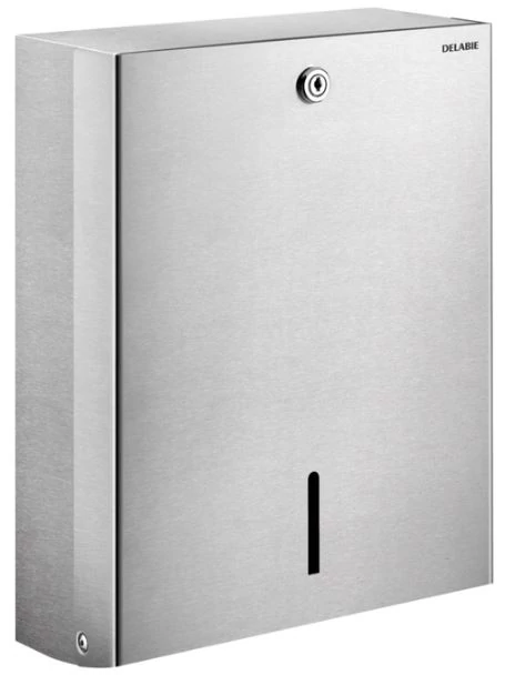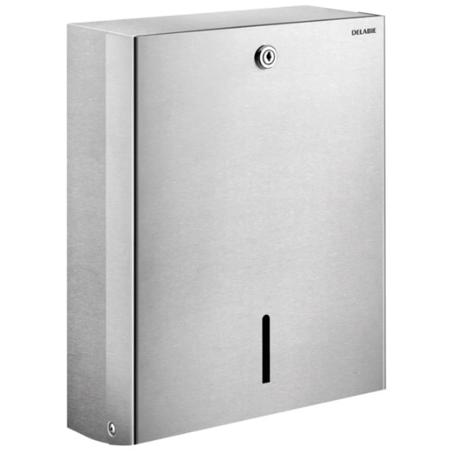 DELABIE C/Z hajtott vandálbiztos papírkéztörlő adagoló, 500 lap, zárható, r.m. acél, fényes