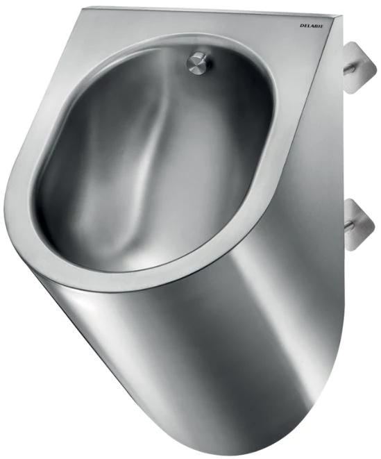 DELABIE DELTA piszoár fali konzolos rögzítéssel, perem nélküli kialakítás, öblítőfejes, flexibilis bekötőcsővel, hátsó bekötés, r.m. acél, selyem, 1,2 mm