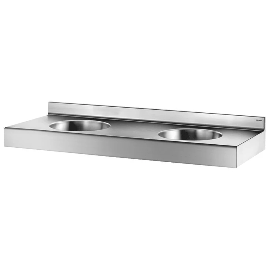 DELABIE DUPLO RP vandálbiztos sormosdó 1200 mm, két személyes, hátfallal, 35 mm-es középső csapfurattal, szifontakaró nélkül, r.m. acél, 1,5 mm falvastagság