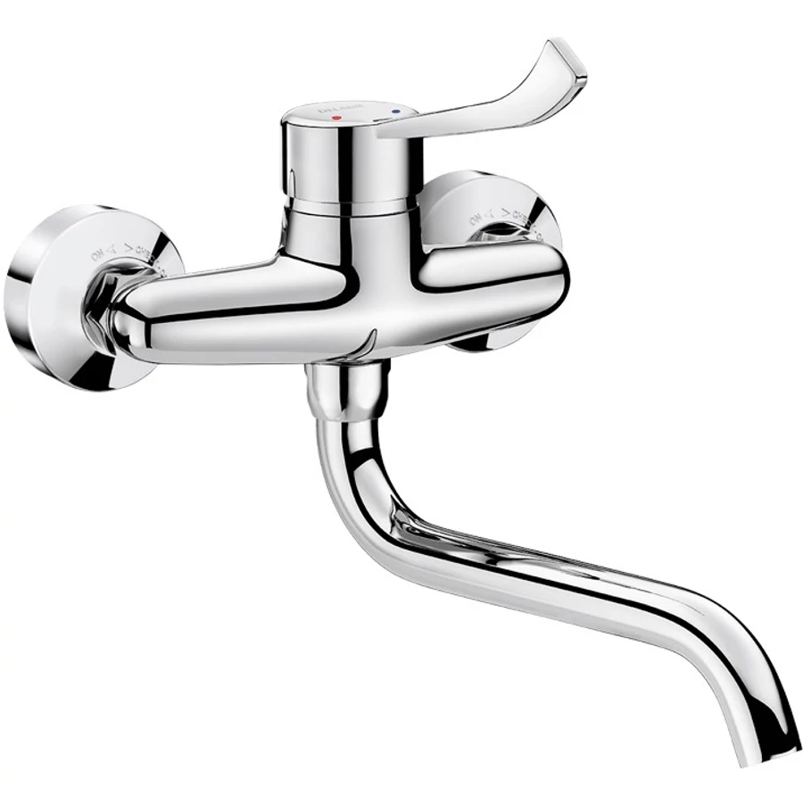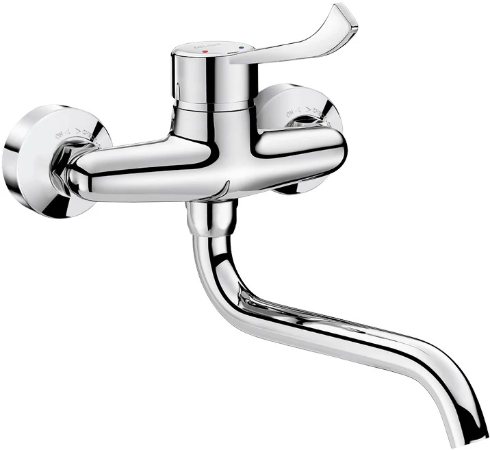 DELABIE fali mosogató csaptelep lyukas keverőkarral, lengő kifolyóval, L=200mm, STOP/CHECK takarótárcsákkal, ipari vízátfolyás, 26L/p