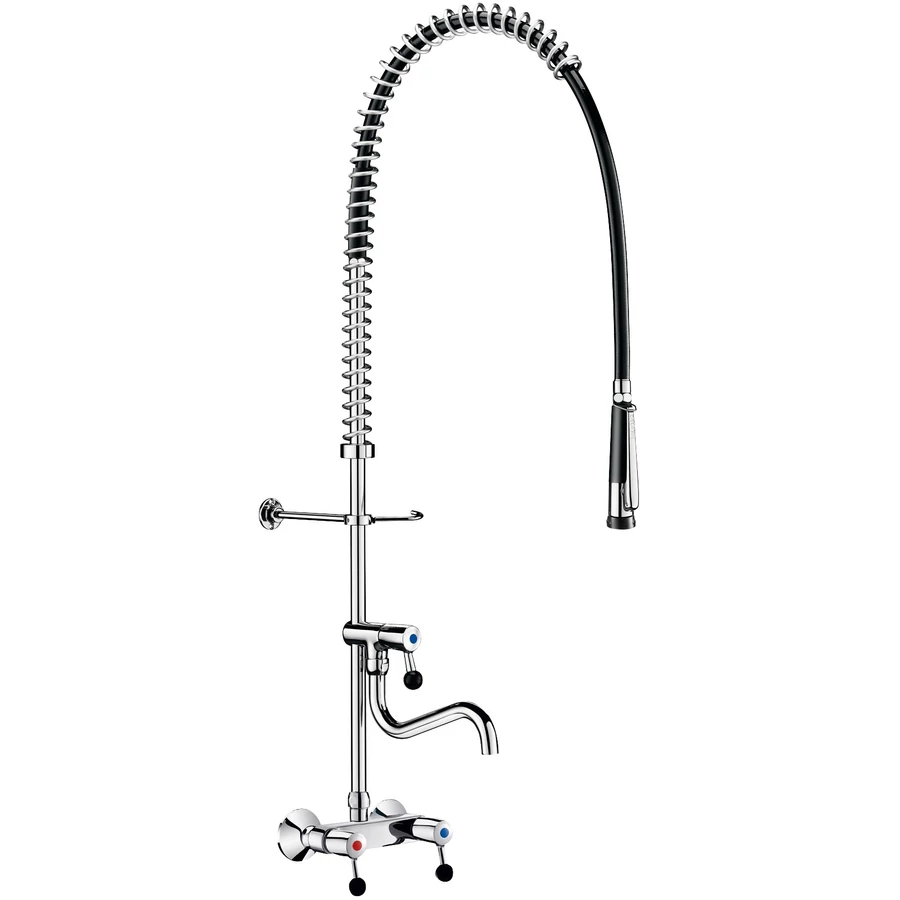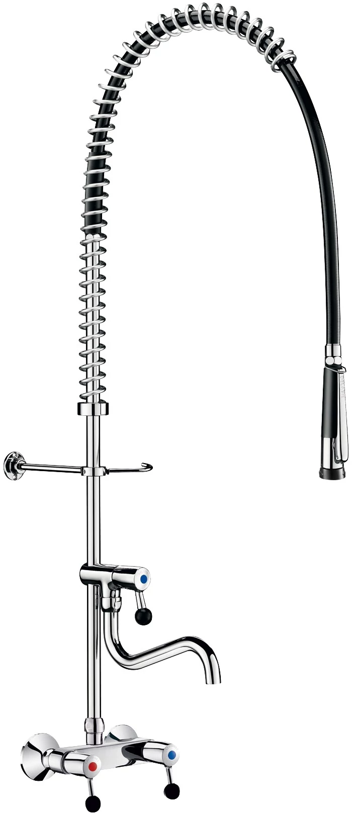 DELABIE fali nagykonyhai mosogató csap lengő kifolyóval, r.m. acél rugóval megerősített antitorziós, fehér PVC tömlős elő-öblítő zuhannyal