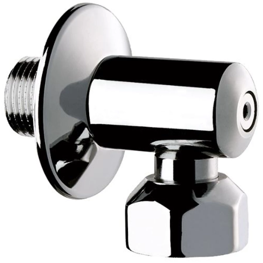 DELABIE falon kívüli könyökcsatlakozó integrált elzárószelep takarótárcsával, M1/2" - F3/4" csatlakozásokkal, sárgaréz, krómozott fényes