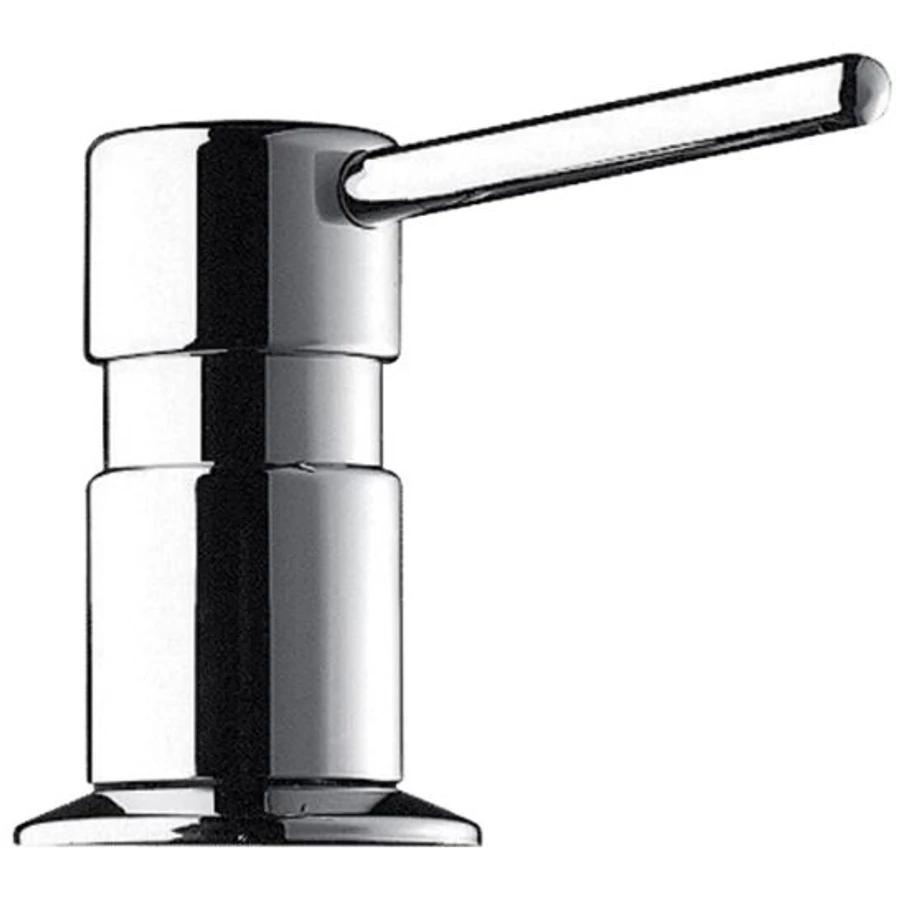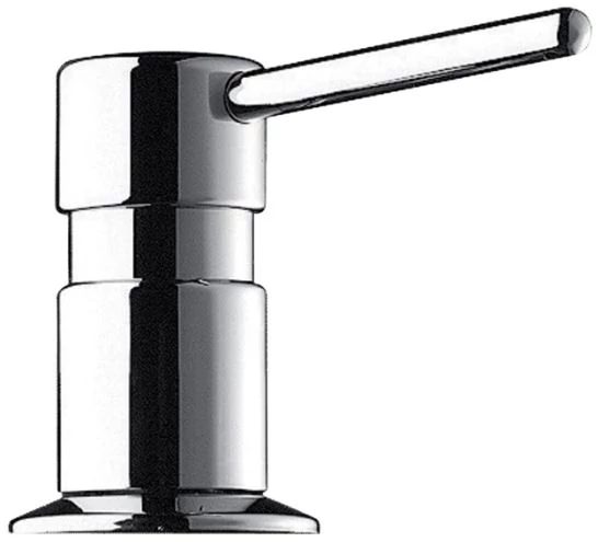 DELABIE mosdópultba süllyesztett, nyomógombos folyékonyszappan adagoló, 40mm vastag pultokig, 95mm kifolyó, 1.2m tömlővel kannás beadagoláshoz, r.m. acél, fényes