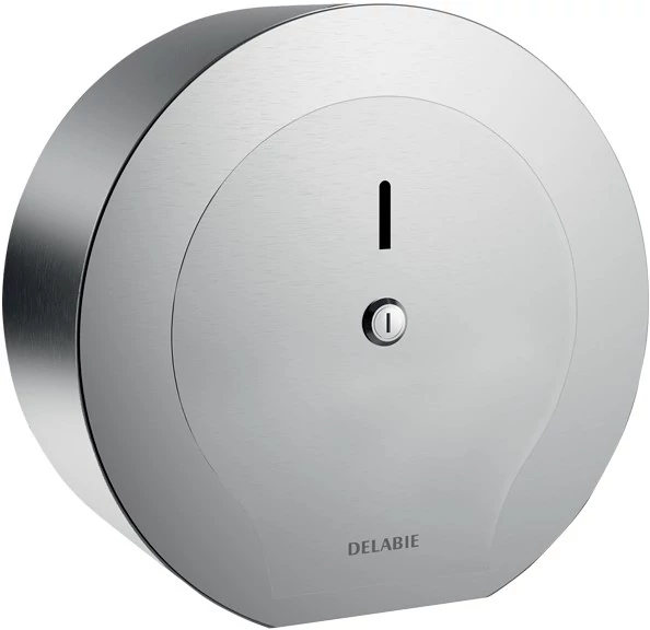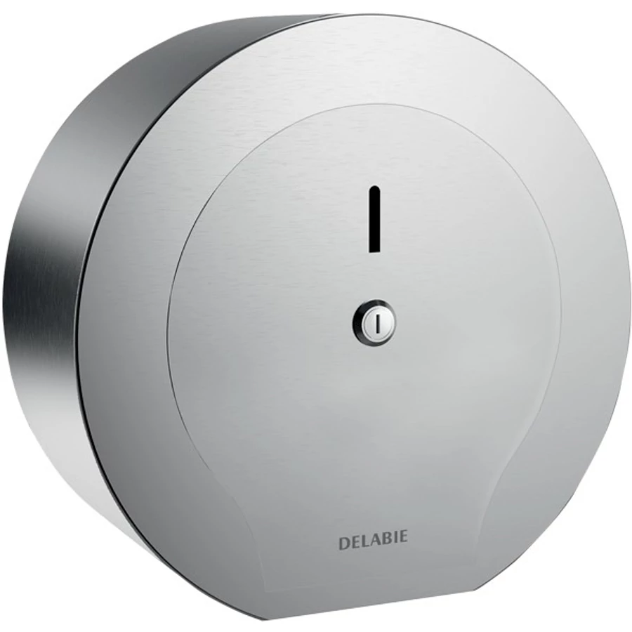 DELABIE ipari nagytekercses WC-papír adagoló 200m tekercsekhez, D=245mm, zárható, vandálbiztos r.m. acél ház, fényes
