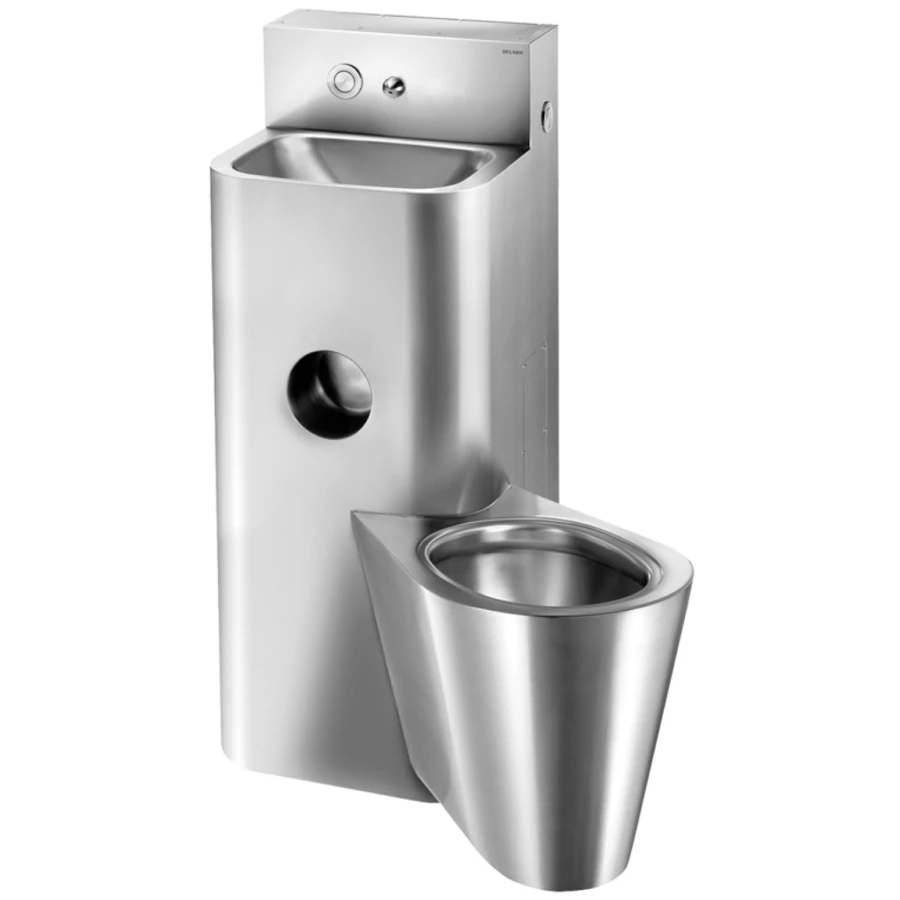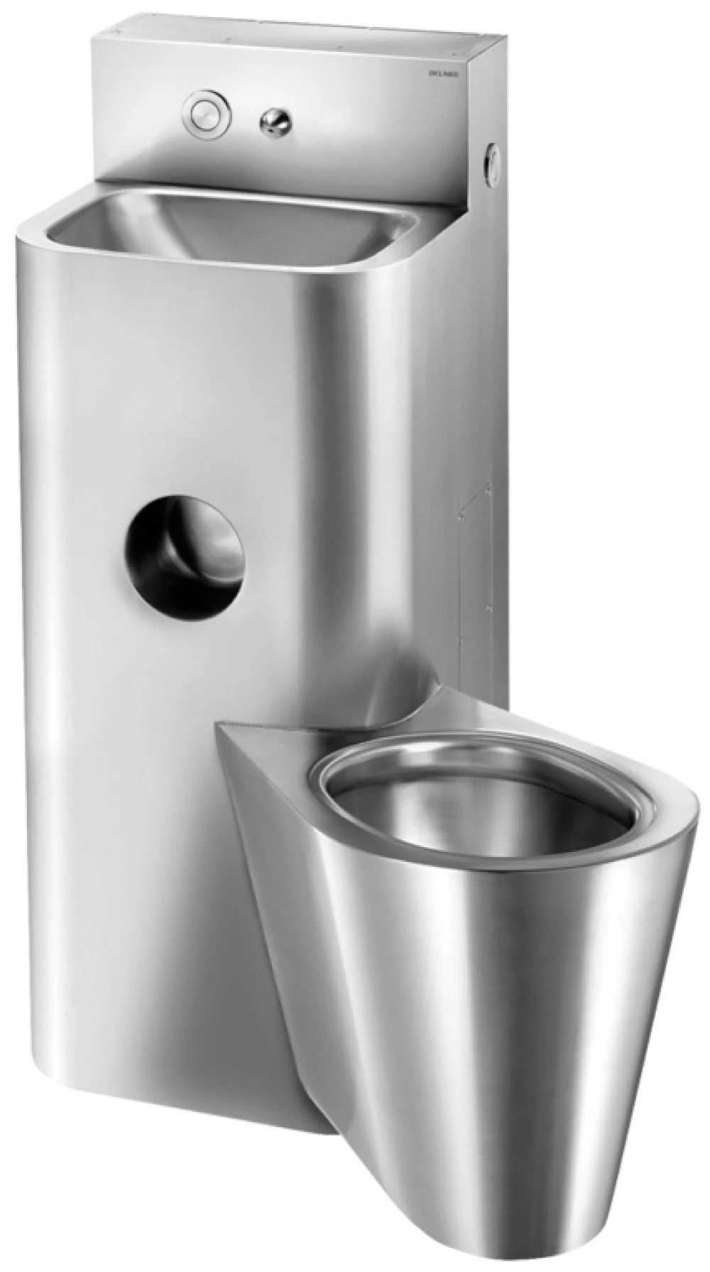 DELABIE kompakt fali börtön szaniter - blokkolásgátlós csappal szerelt vandálbiztos kézmosó, direkt öblítésű jobbos álló WC-vel, r.m. acél, 2 mm