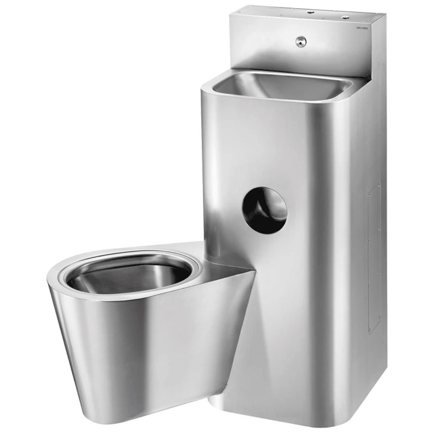 DELABIE kompakt fali börtön szaniter - blokkolásgátlós csappal szerelt vandálbiztos kézmosó, öblítőtartályos jobbos álló WC-vel, r.m. acél, 2 mm