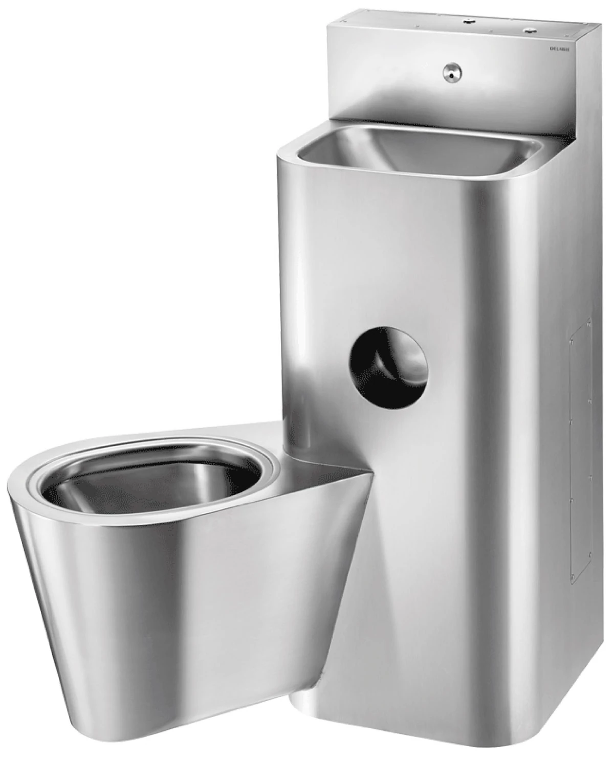 DELABIE kompakt fali börtön szaniter - blokkolásgátlós csappal szerelt vandálbiztos kézmosó, öblítőtartályos középső álló WC-vel, r.m. acél, 2 mm