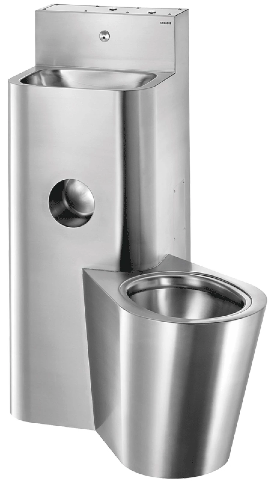 DELABIE kompakt fali börtön szaniter - blokkolásgátlós csappal szerelt vandálbiztos kézmosó, öblítőtartályos balos álló WC-vel, r.m. acél, 2 mm