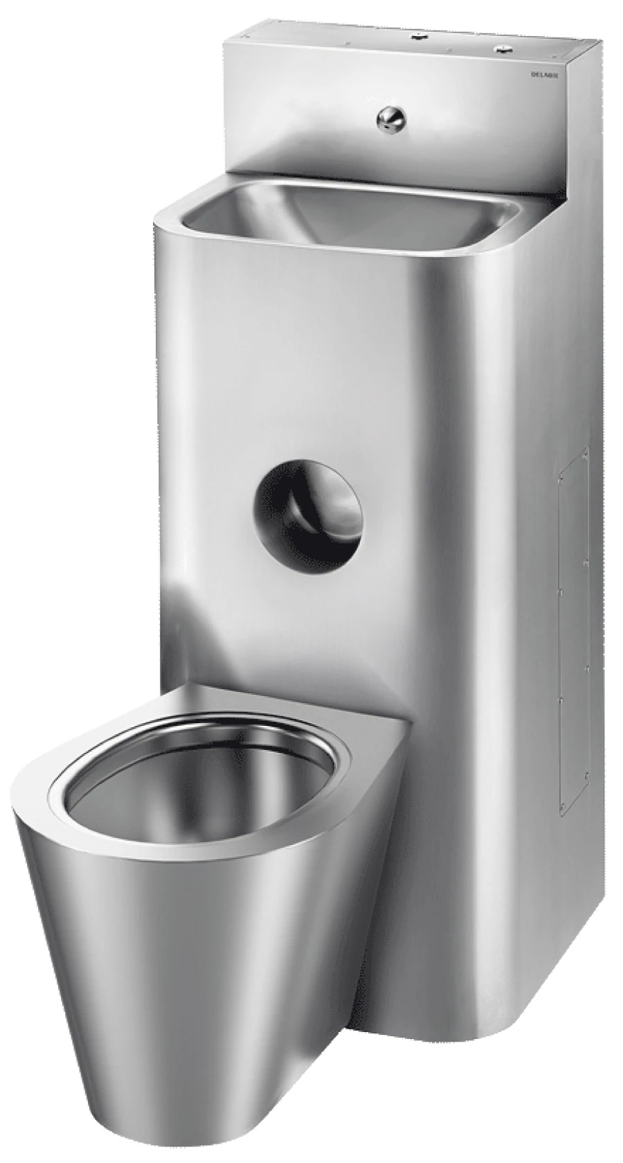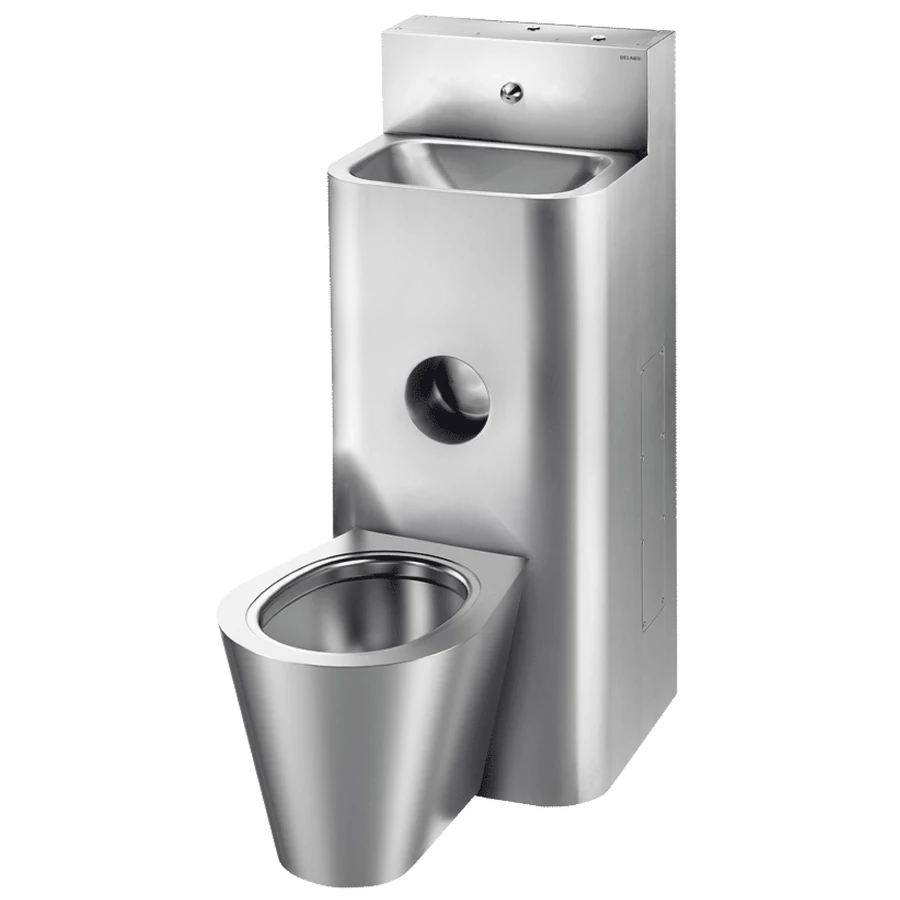 DELABIE kompakt fali börtön szaniter - blokkolásgátlós csappal szerelt vandálbiztos kézmosó, öblítőtartályos jobbos álló WC-vel, r.m. acél, 2 mm