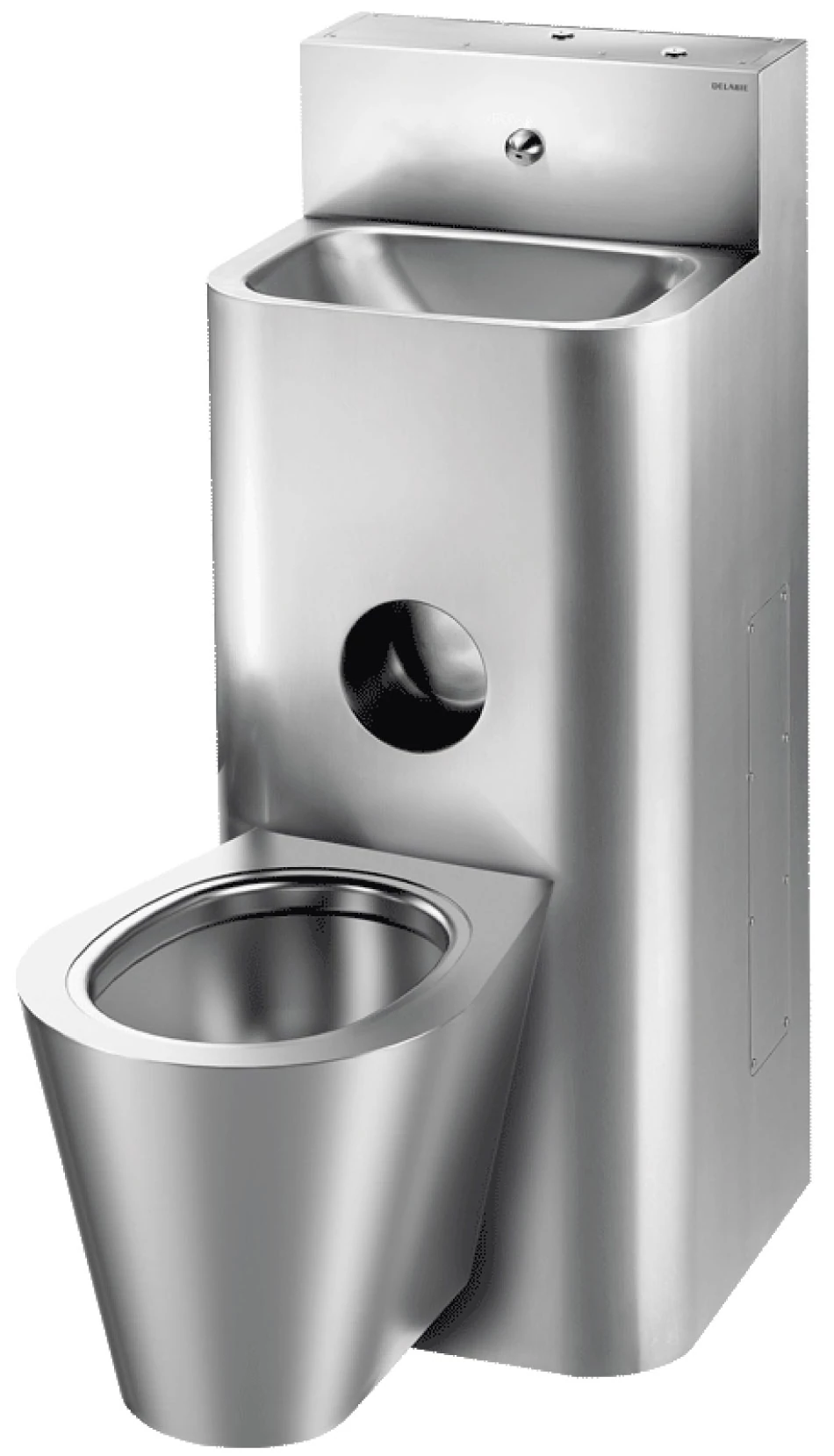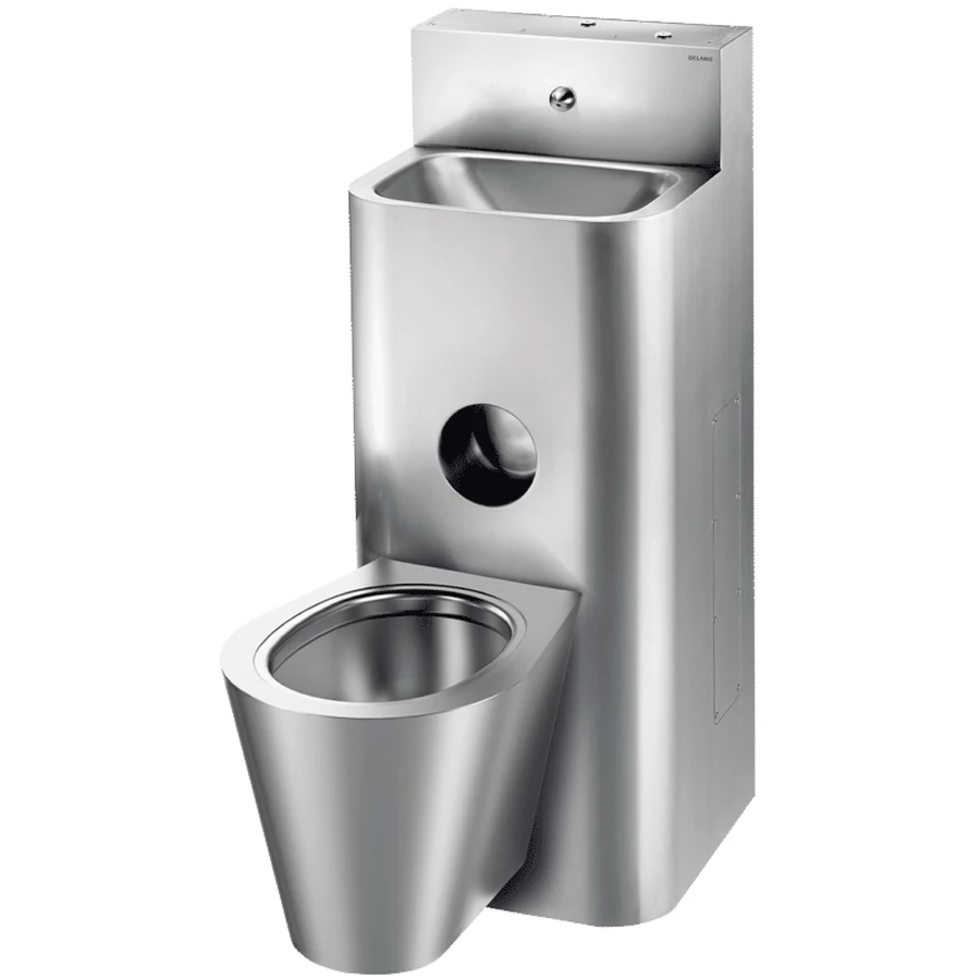 DELABIE kompakt fali börtön szaniter - blokkolásgátlós csappal szerelt vandálbiztos kézmosó, öblítőtartályos jobbos álló WC-vel, r.m. acél, 2 mm
