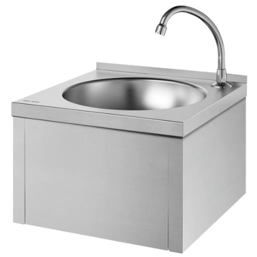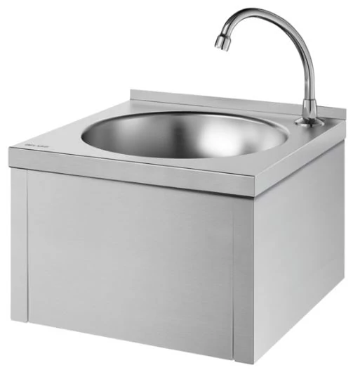 DELABIE GENOU rozsdamentes acél fali kézmosó szett önelzáró, időzített térdkapcsolóval, lengő kifolyóval, leeresztőszeleppel, kevert vízre