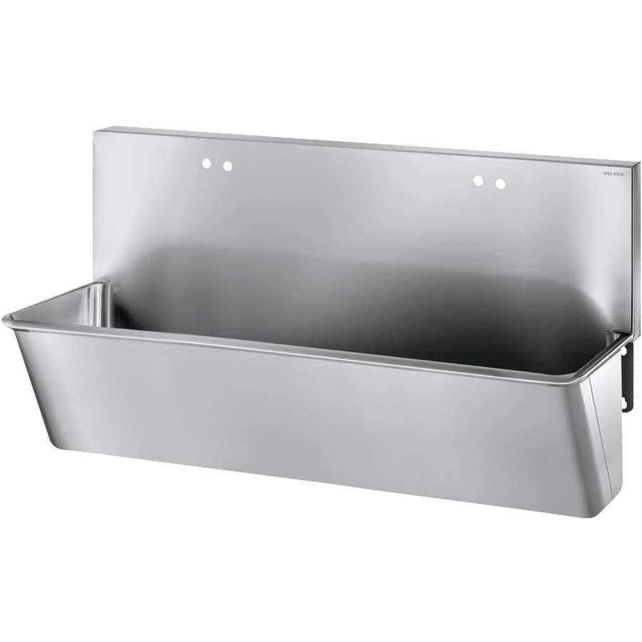 DELABIE sebészi bemosakodó vályú magas hátfallal, csapfurat nélkül, két állásos 1400mm, r.m. acél