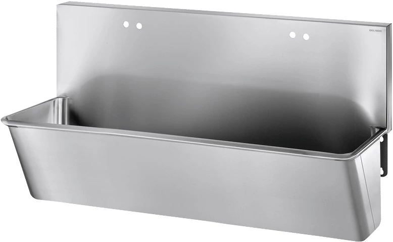 DELABIE sebészi bemosakodó vályú magas hátfallal, kevert vízre 2x1db 22mm csapfurattal, két állásos 1400mm, r.m. acél