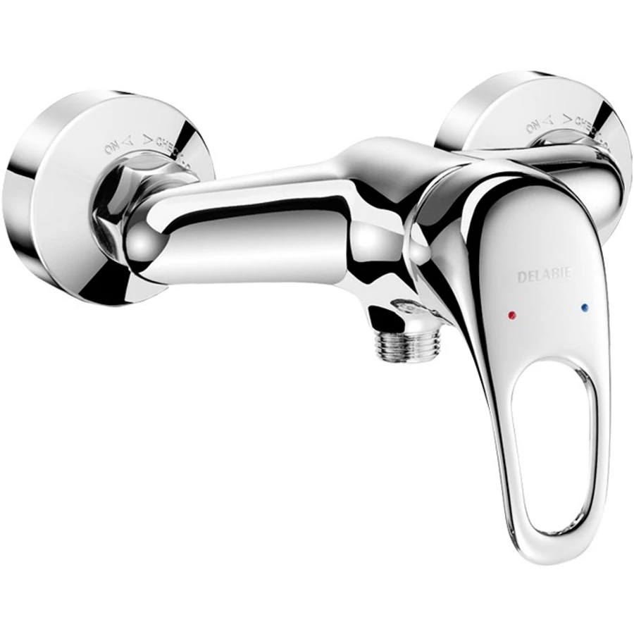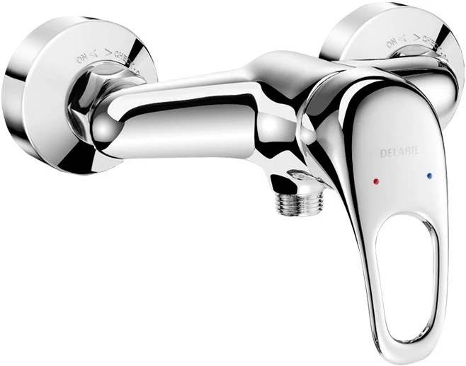 DELABIE falon kívüli karos zuhanyszett, gégecsöves esőztető kézi zuhany, fix zuhanyrózsa tartó, STOP/CHECK tárcsák, önürítő, 9L/p